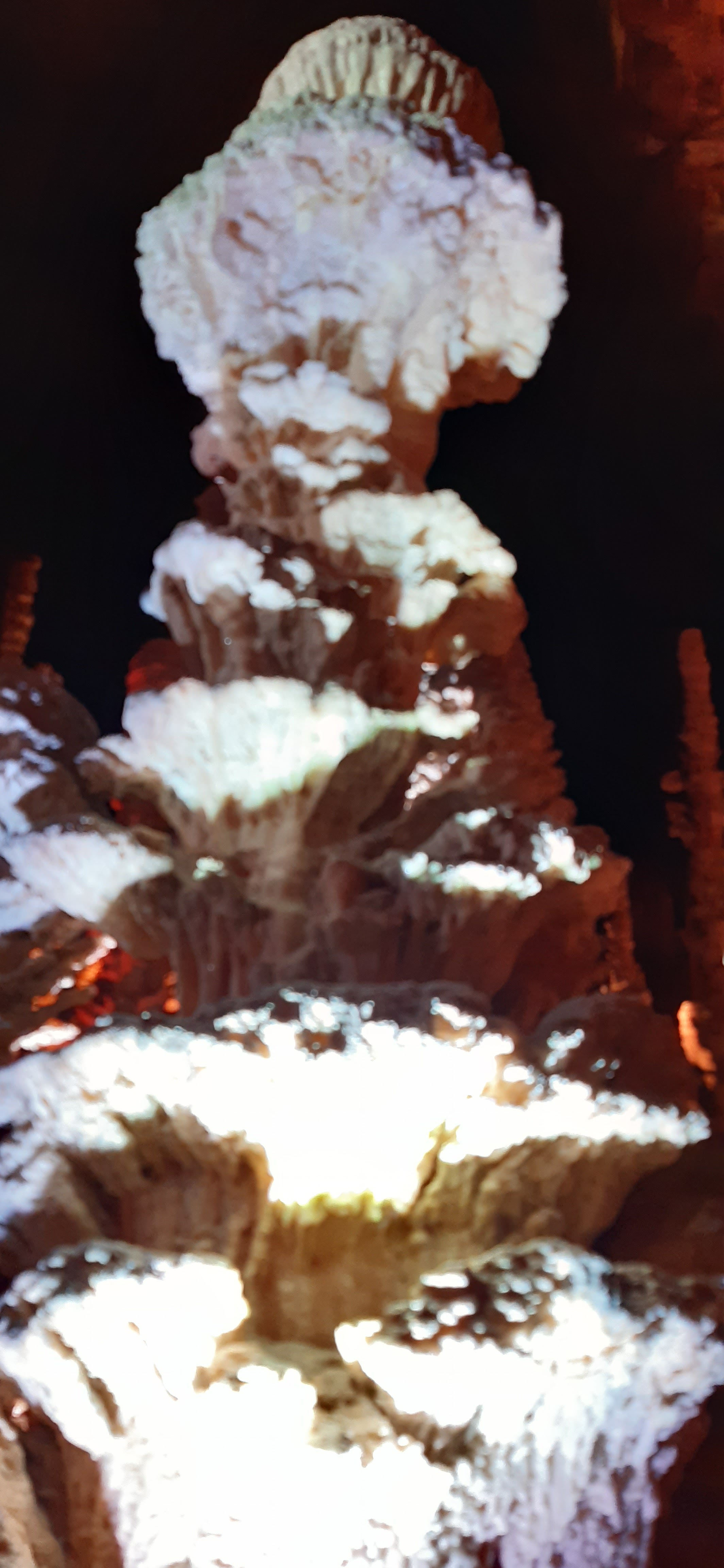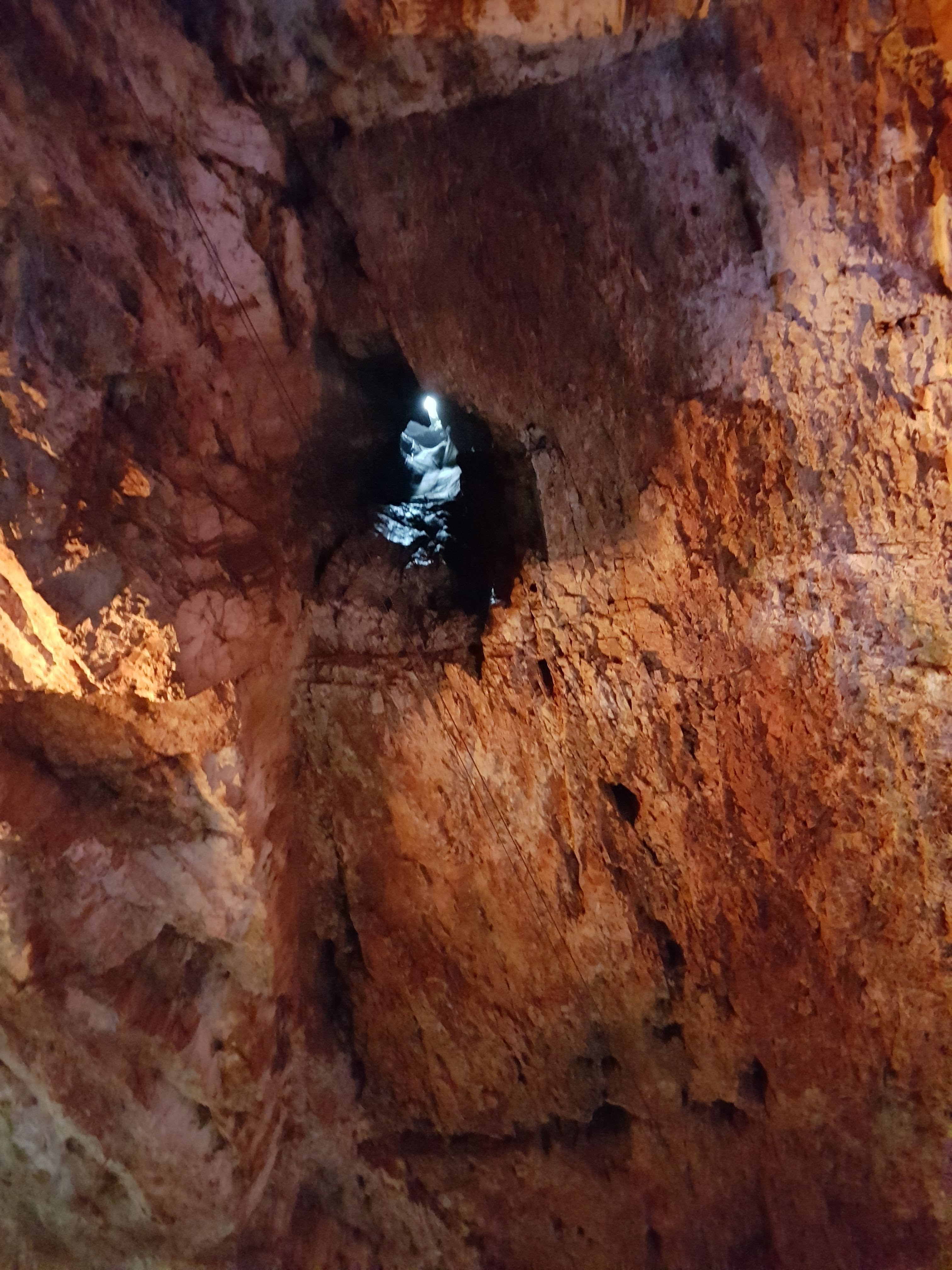 Souvent visite des grottes auparavant,mais jamais encore un aven. J'ai eu droit à une Immense salle de près de 70m de haut avec des stalactites relativement petites mais des stalagmites époustouflantes. La hauteur fait exploser les gouttes une fois au sol et elles ont tendance à se former telles des piles d'assiettes, ou des gâteaux à la broche. Content d'avoir vu ça.