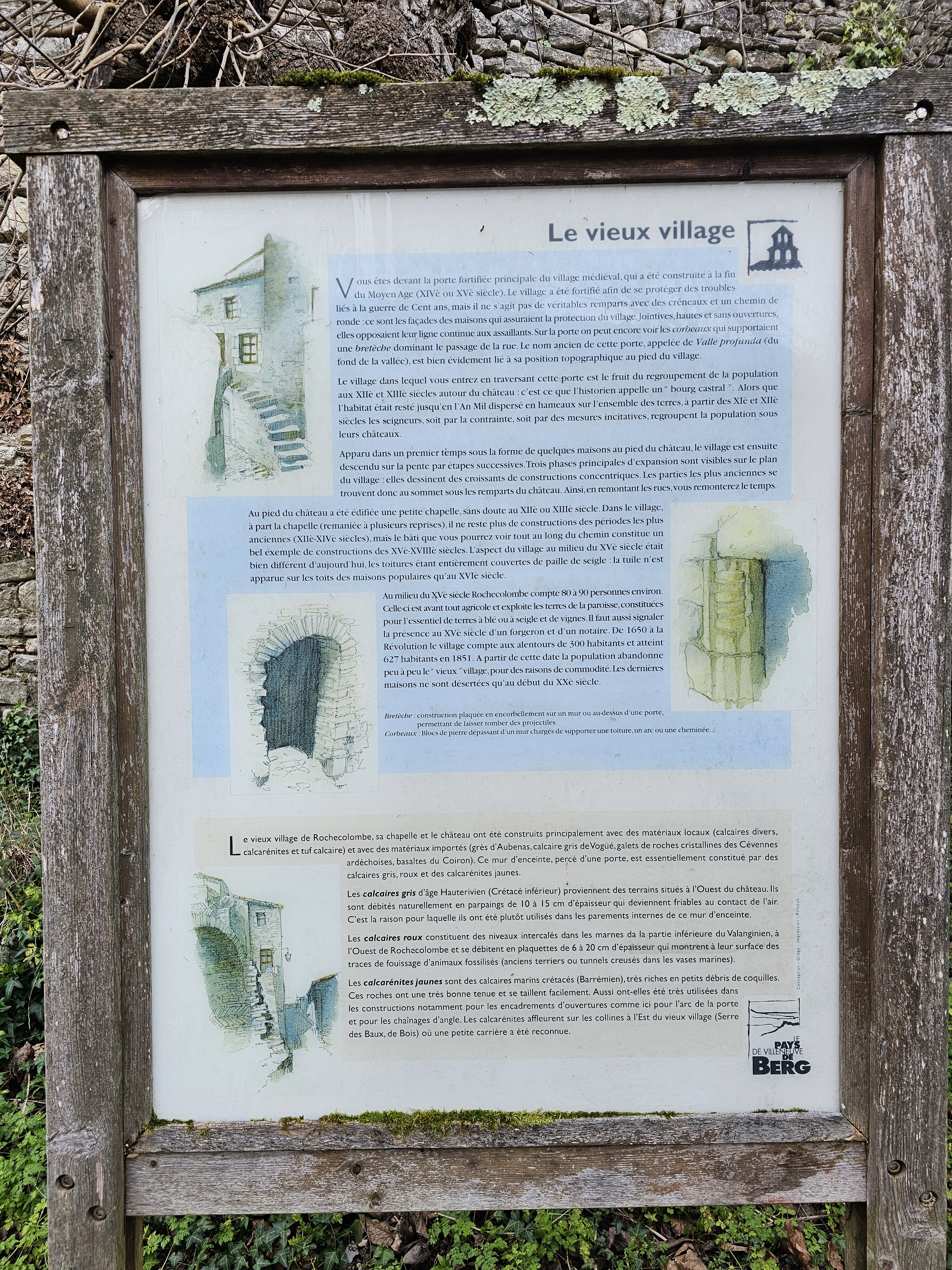Rochecolombe, situé sur la route entre Voguë et Balazuc. Aujourd’hui en ruine, accroché à sa colline, la chapelle St Barthélémy, tout comme la tour de l’ancien château, semble tenir en équilibre tout au dessus des maisons. Les calades (ruelles constituées de galets), irrégulières et raides, s’entrecroisent telles un labyrinthe, et convergent toutes vers le point culminant du vieux village: le belvédère de l’ancien château. avec une vue imprenable sur les plateaux alentours. la cascade en arrière plan du village est à sec.