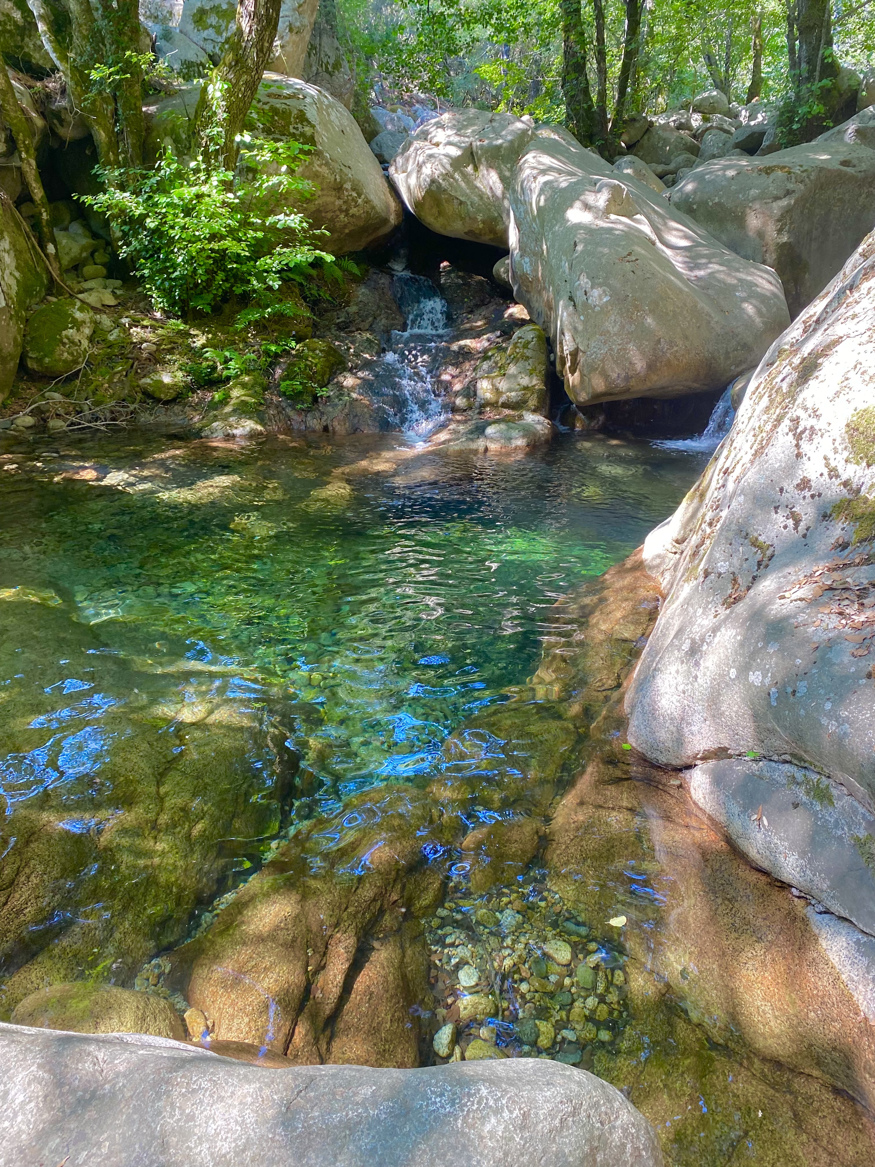 Super coin : eau transparente, jolis reflets verts. Cuvettes idéales pour se baigner ou faire du canyoning.