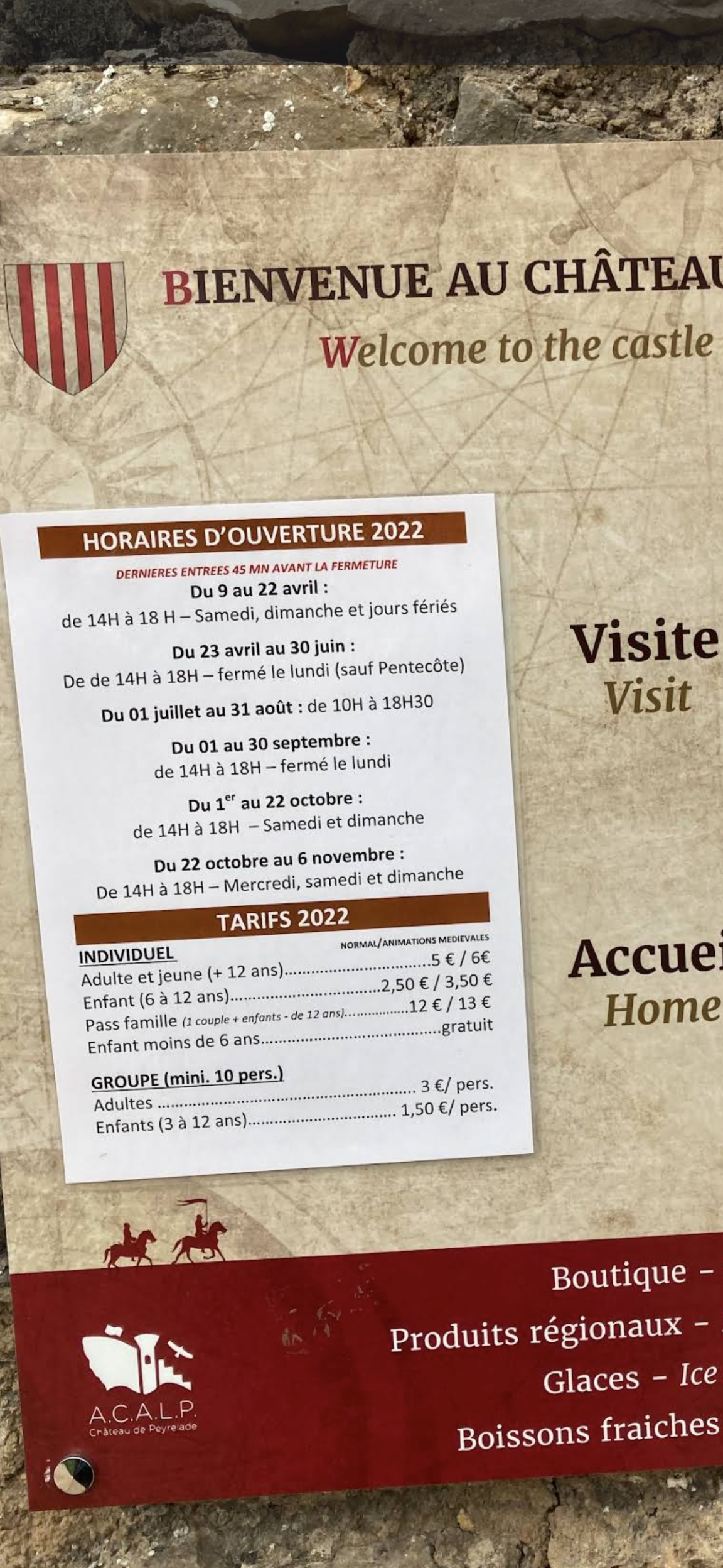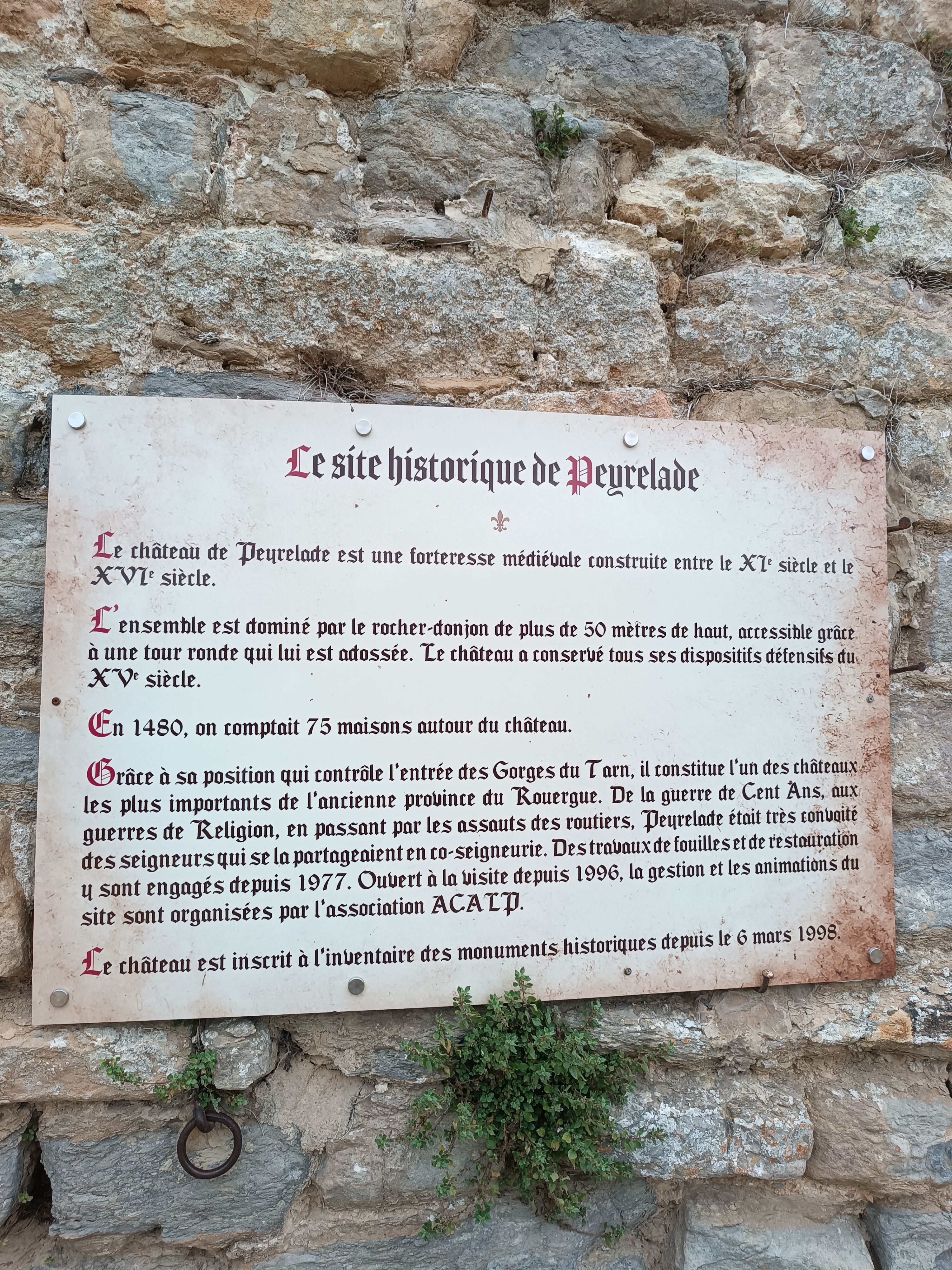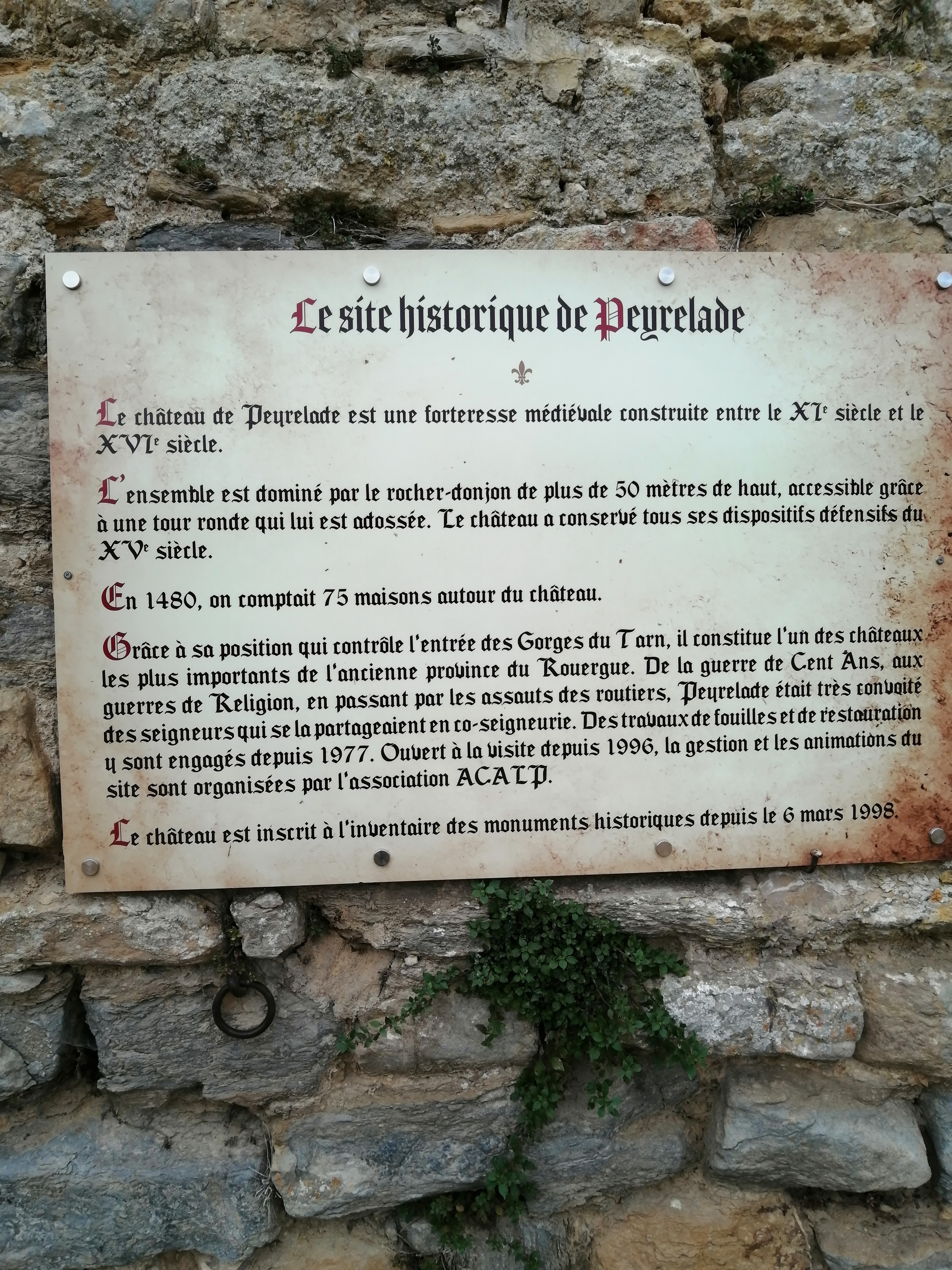 Ce château est situé au sommet d'une montagne. C'est un petit château et vous pouvez le traverser en 45 minutes environ. En juillet et août, de vrais chevaliers sont présents au château les mardis et mercredis et il y a même un spectacle à 16h45 où ils reconstituent un siège. Le château offre de nombreuses et belles vues sur les montagnes et vallées de Peyrelade et de la Boyne. Lors de l'achat de vos billets, vous recevrez un manuel en néerlandais afin que vous puissiez lire l'histoire du château aux différents points indiqués. Dans l'ensemble, ce fut une belle expérience et si vous arrivez tôt lors de ces journées d'animation, vous pouvez conserver votre billet afin de pouvoir revenir l'après-midi pour le spectacle. Il n'est certes pas nécessaire de réserver à l'avance, mais les places de parking sont limitées à proximité du château, alors gardez cela à l'esprit lorsque vous y allez. La courte promenade jusqu'au château est assez raide et dans le château lui-même, les chemins et les escaliers sont parfois très raides. Au fait, c'était faisable pour nous et les enfants (4 et 5 ans). Google n'affiche pas non plus cet avis. Un peu démotivant de continuer à rédiger des critiques.