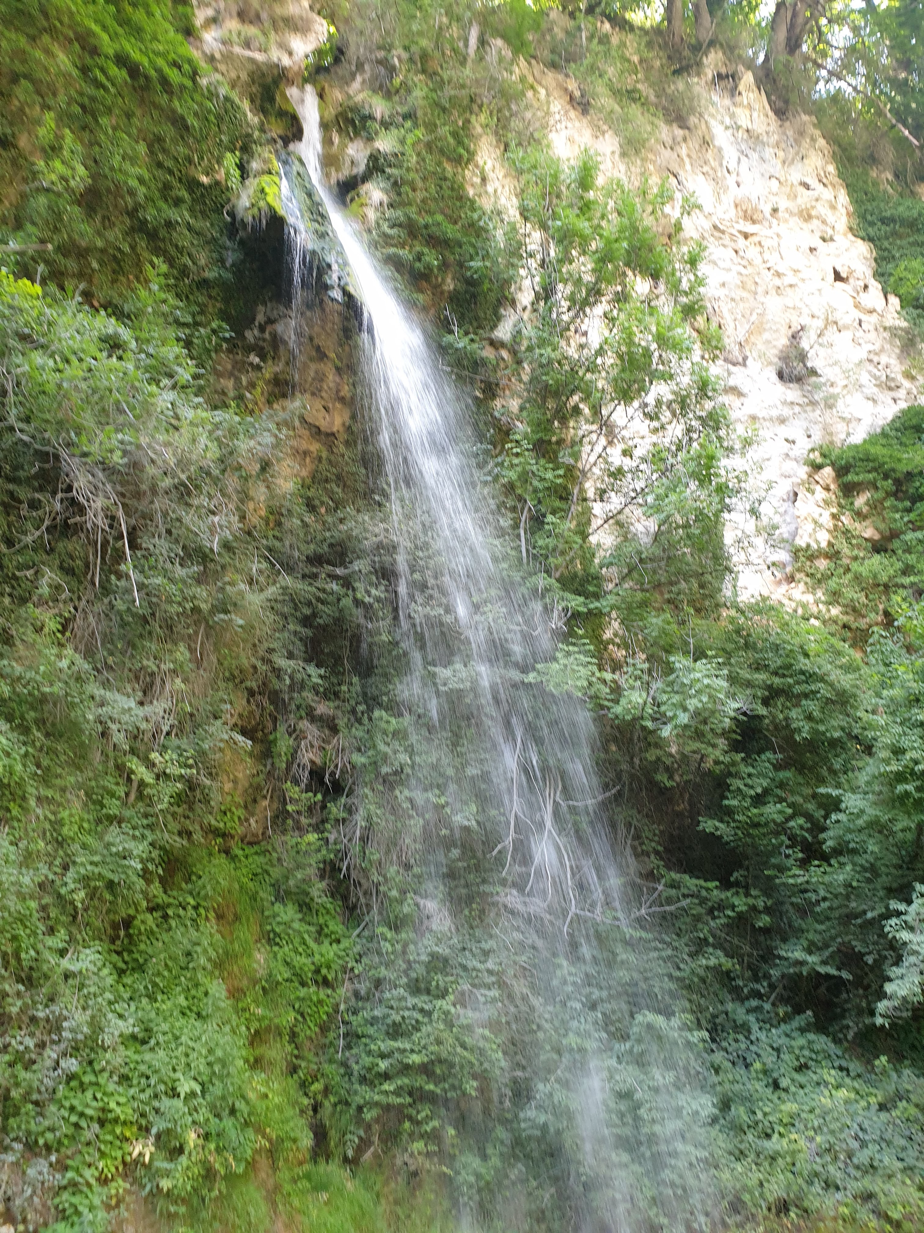 Une petite chute d'eau directement accessible depuis le bord de la route, très verte et rafraîchissante.