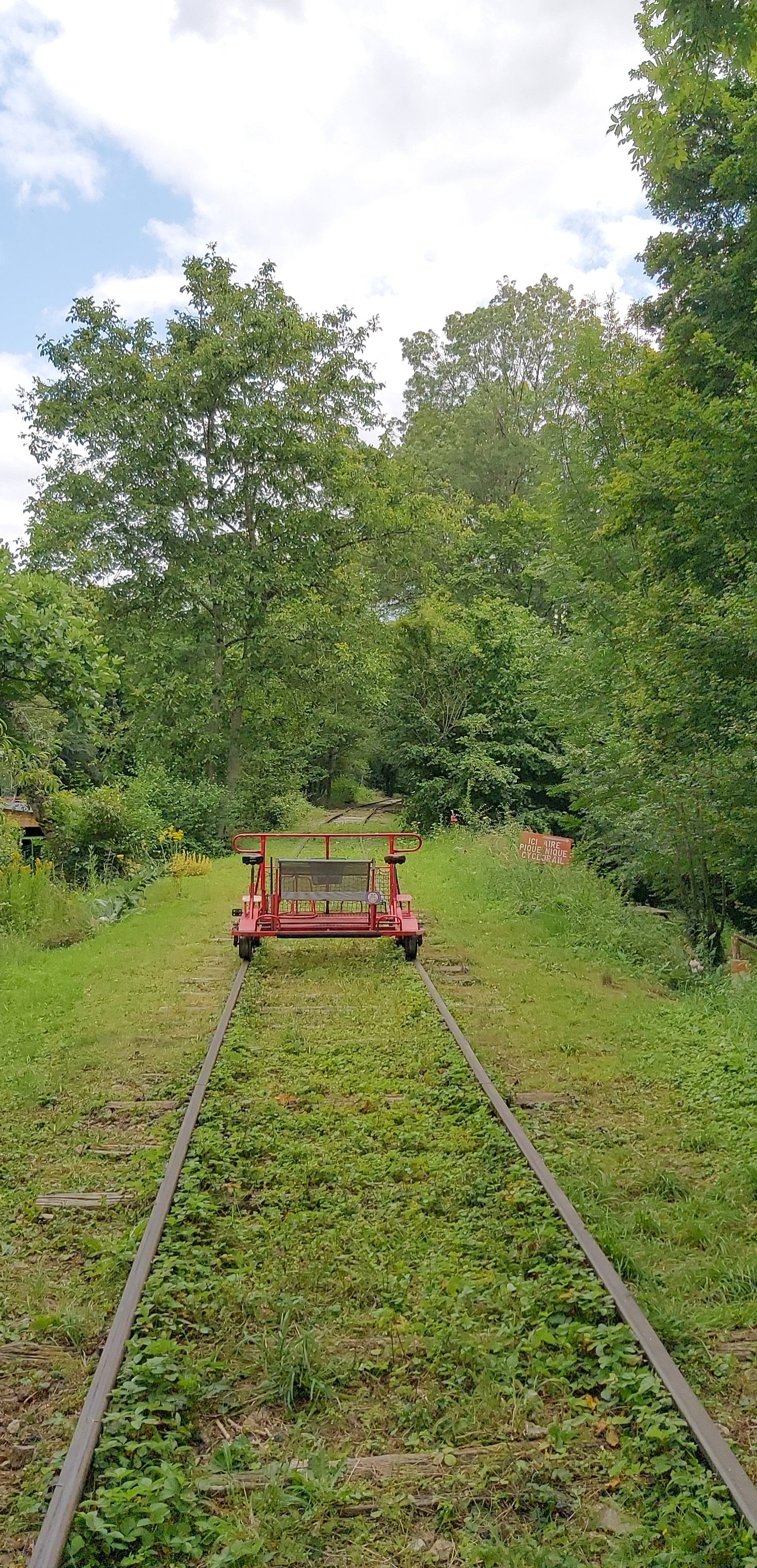 Très joli parcours ombragé de 15 kilomètres que nous avons parcouru avec nos petites -filles. Elles ont adoré propulser elles-mêmes (de temps à autres) le cyclo-rail.