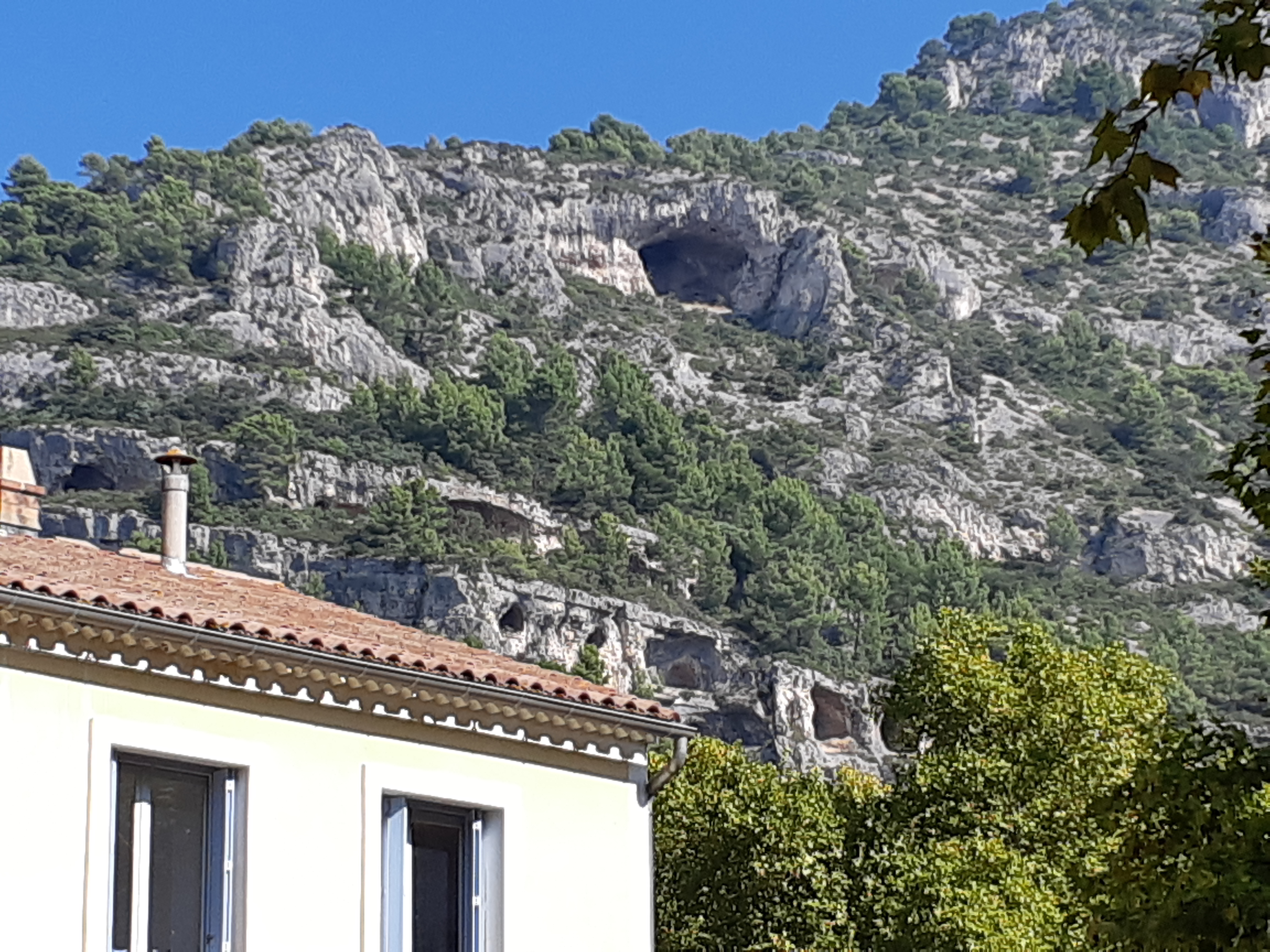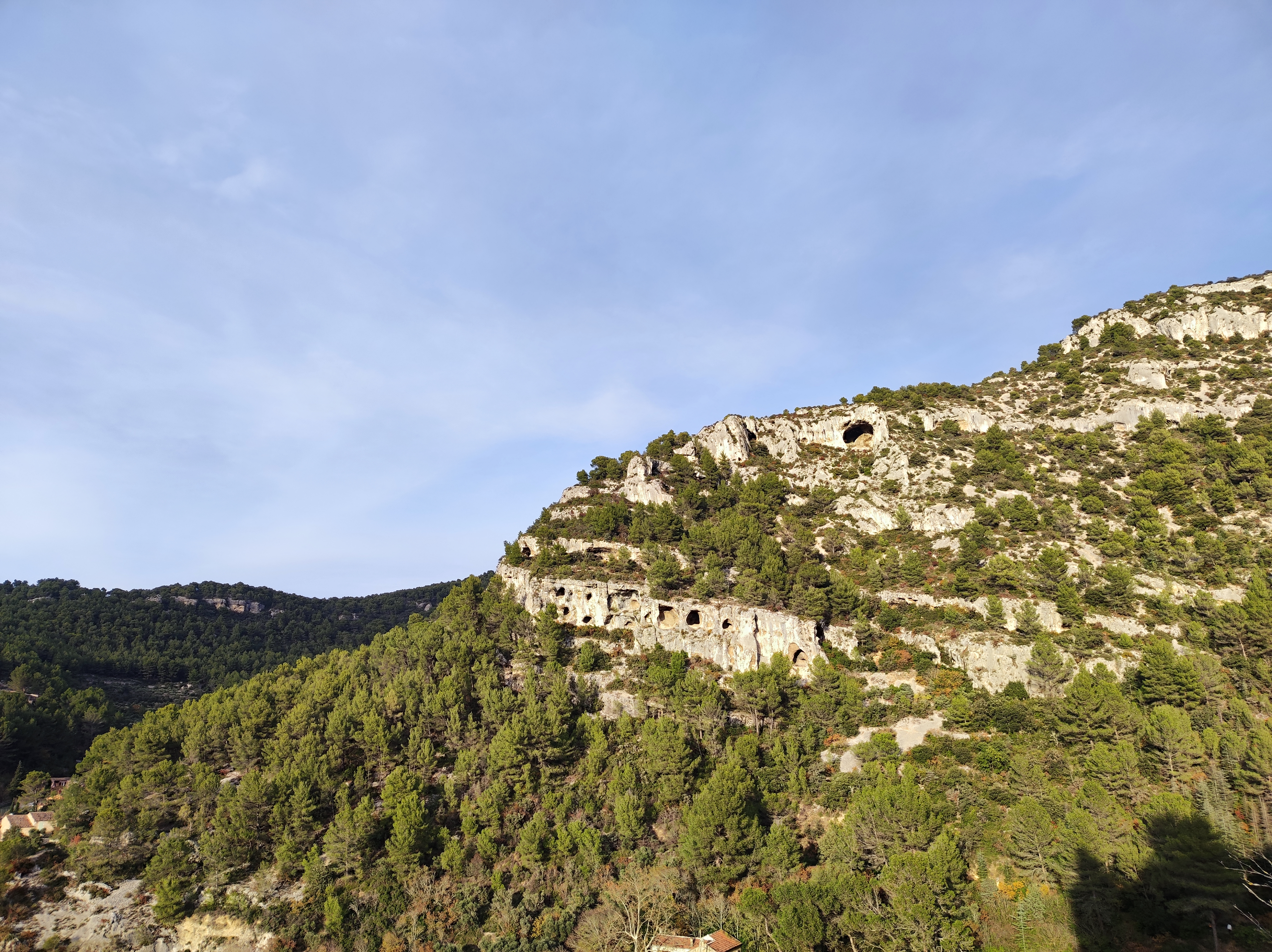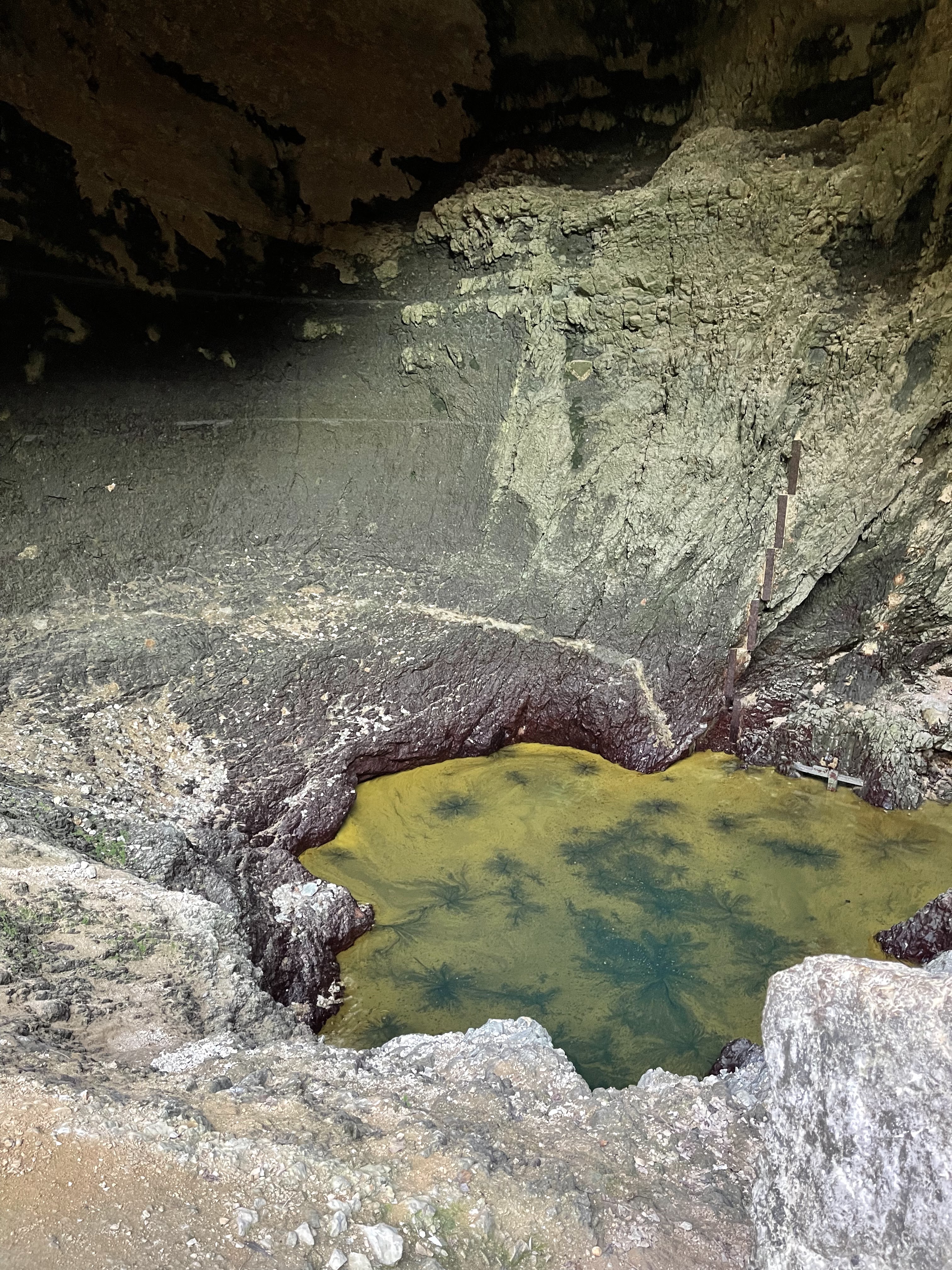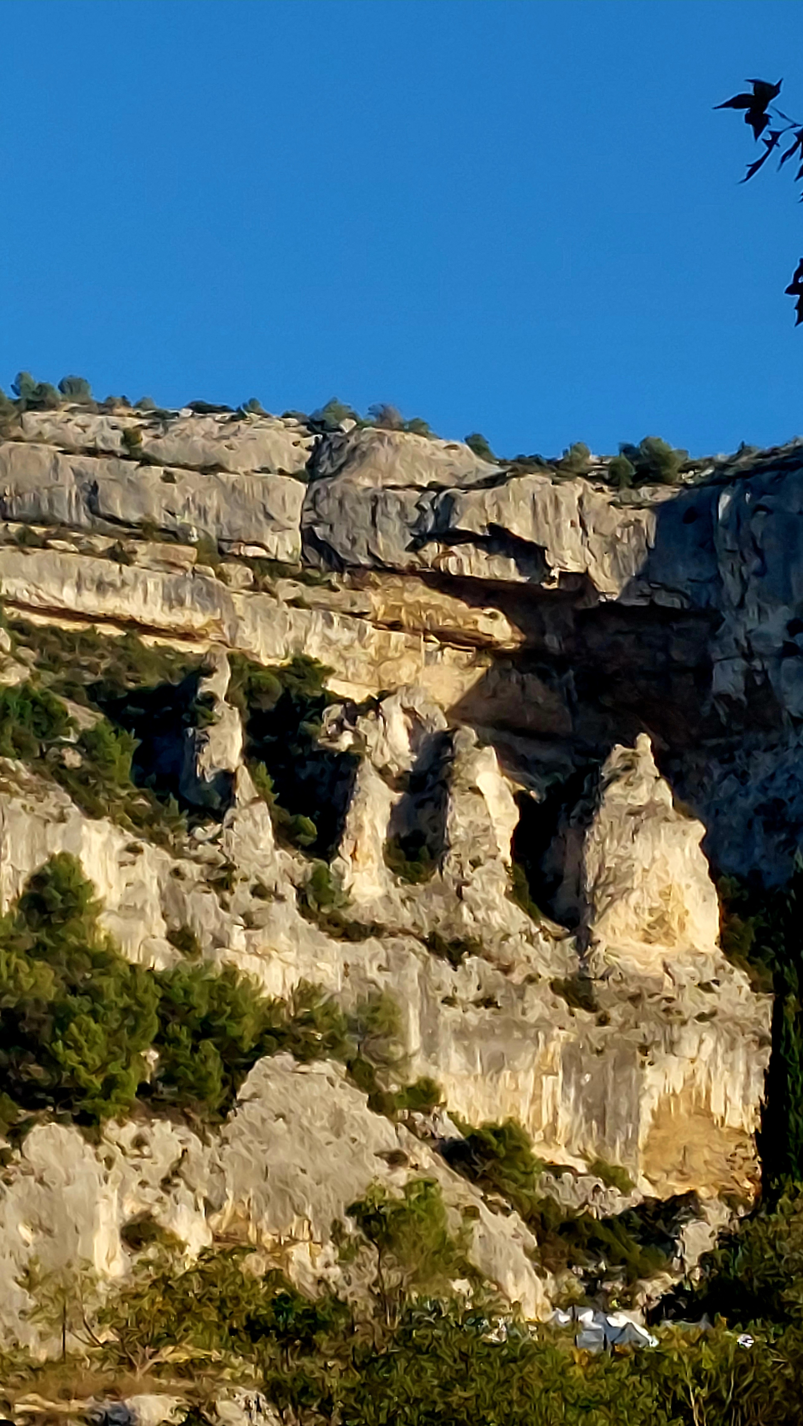 Un peu le bout du monde, on arrive au pied des falaises où une eau jaillit mais en cette saison c'est à sec. Dommage !!