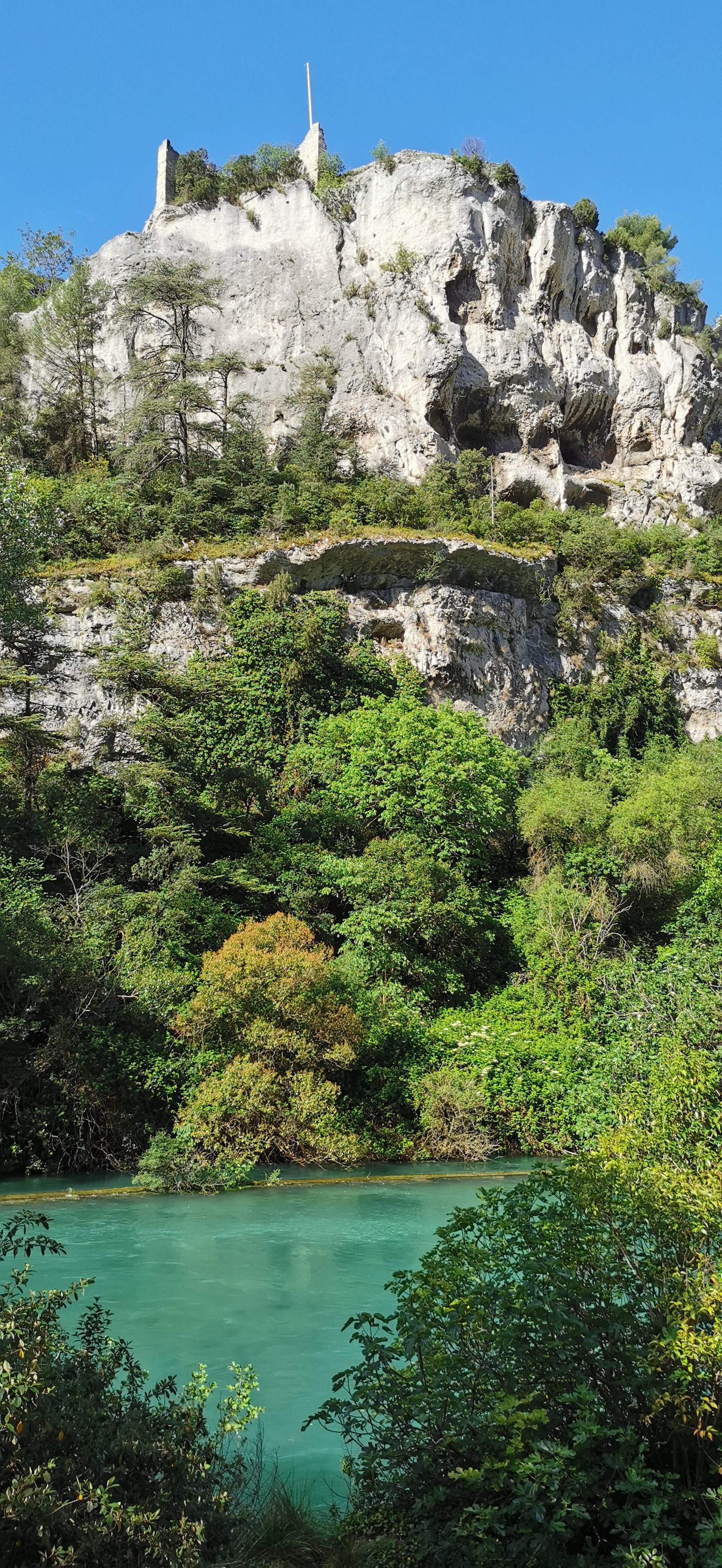 La rivière coule avec force mais la fontaine est vide au pied de la falaise. Toute l'eau vient par résurgence.