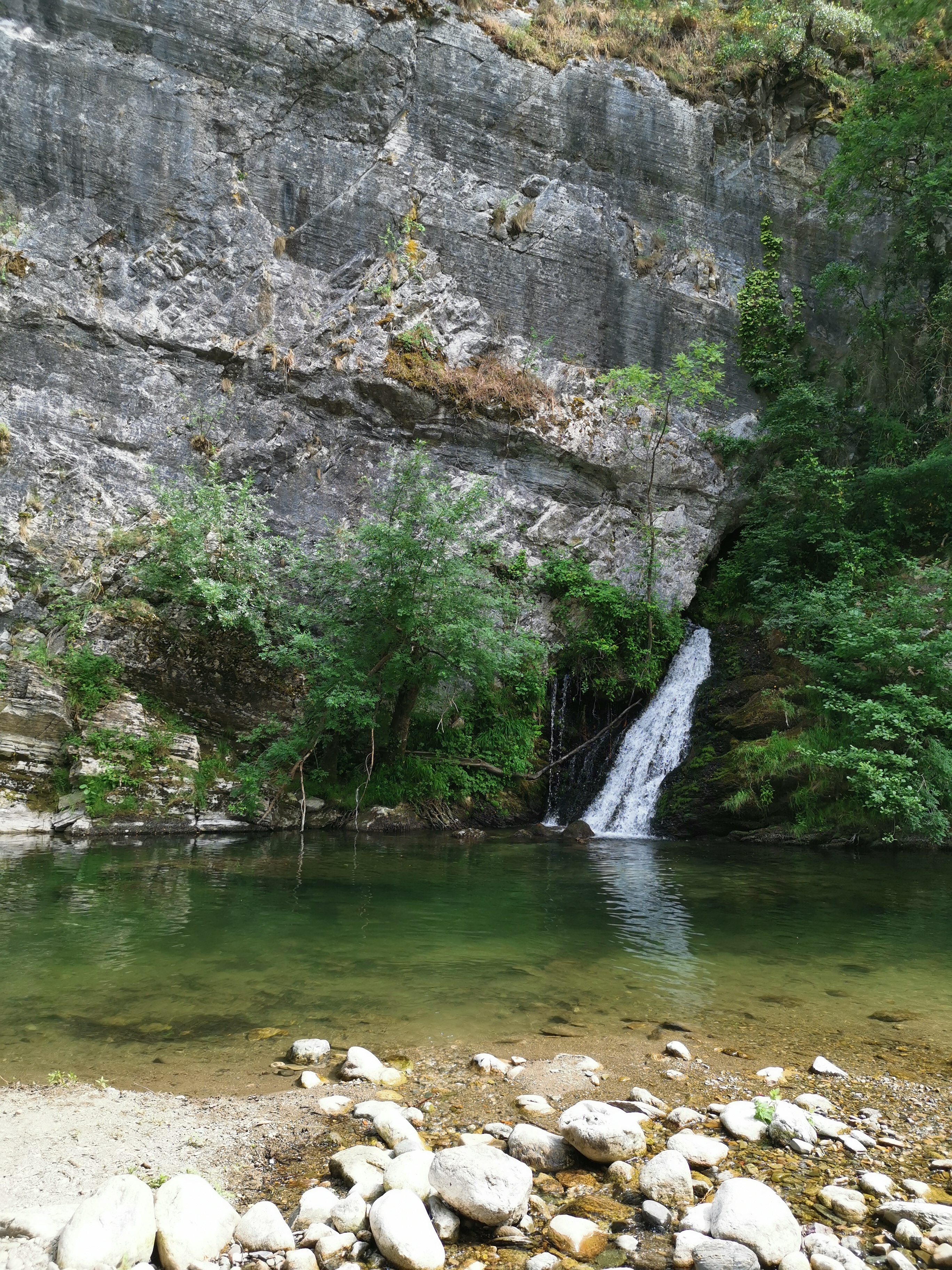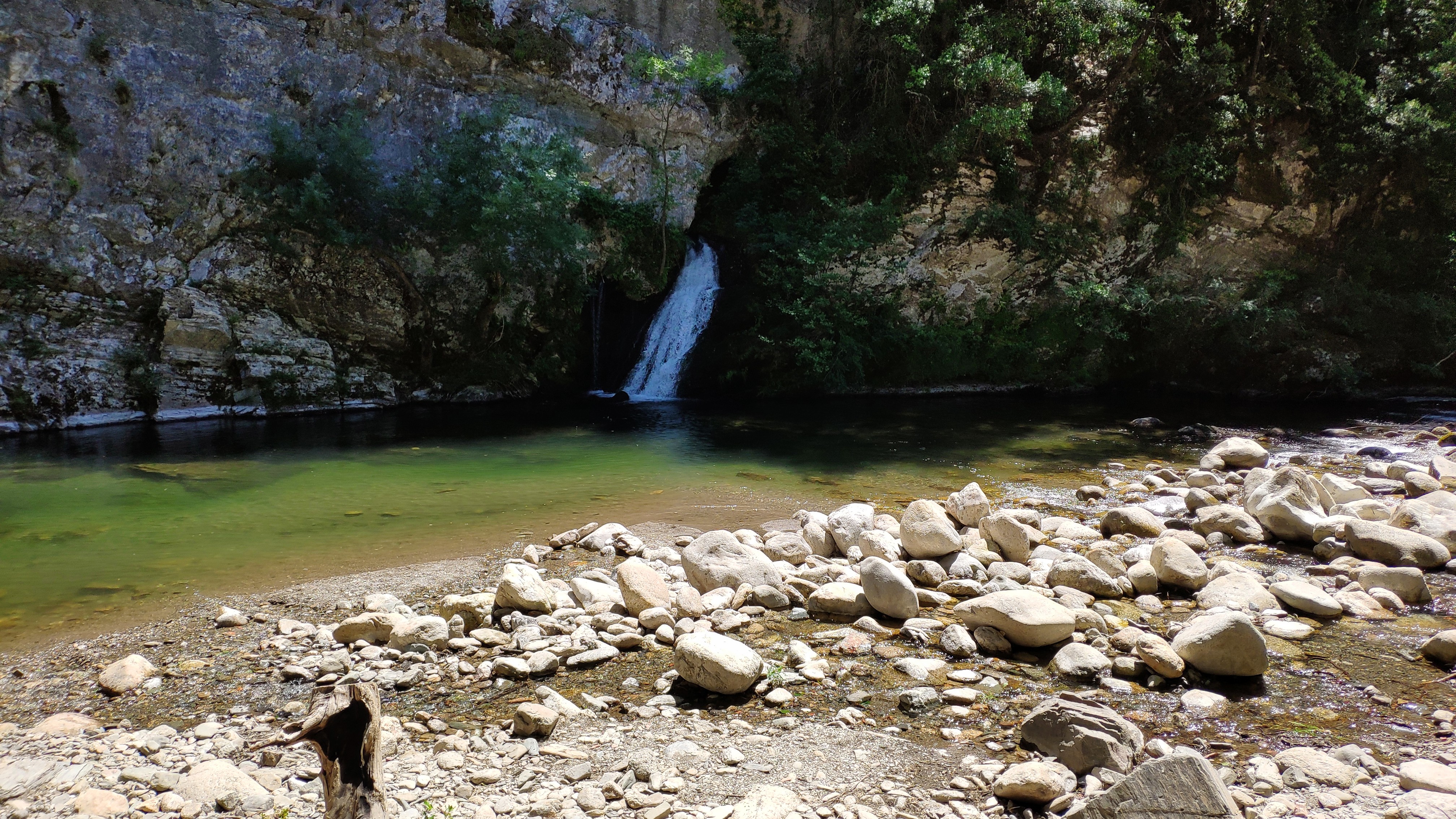 Petit coin au frais avec petite cascade. Prévoir des chaussures pour les cailloux. L'eau est très fraîche