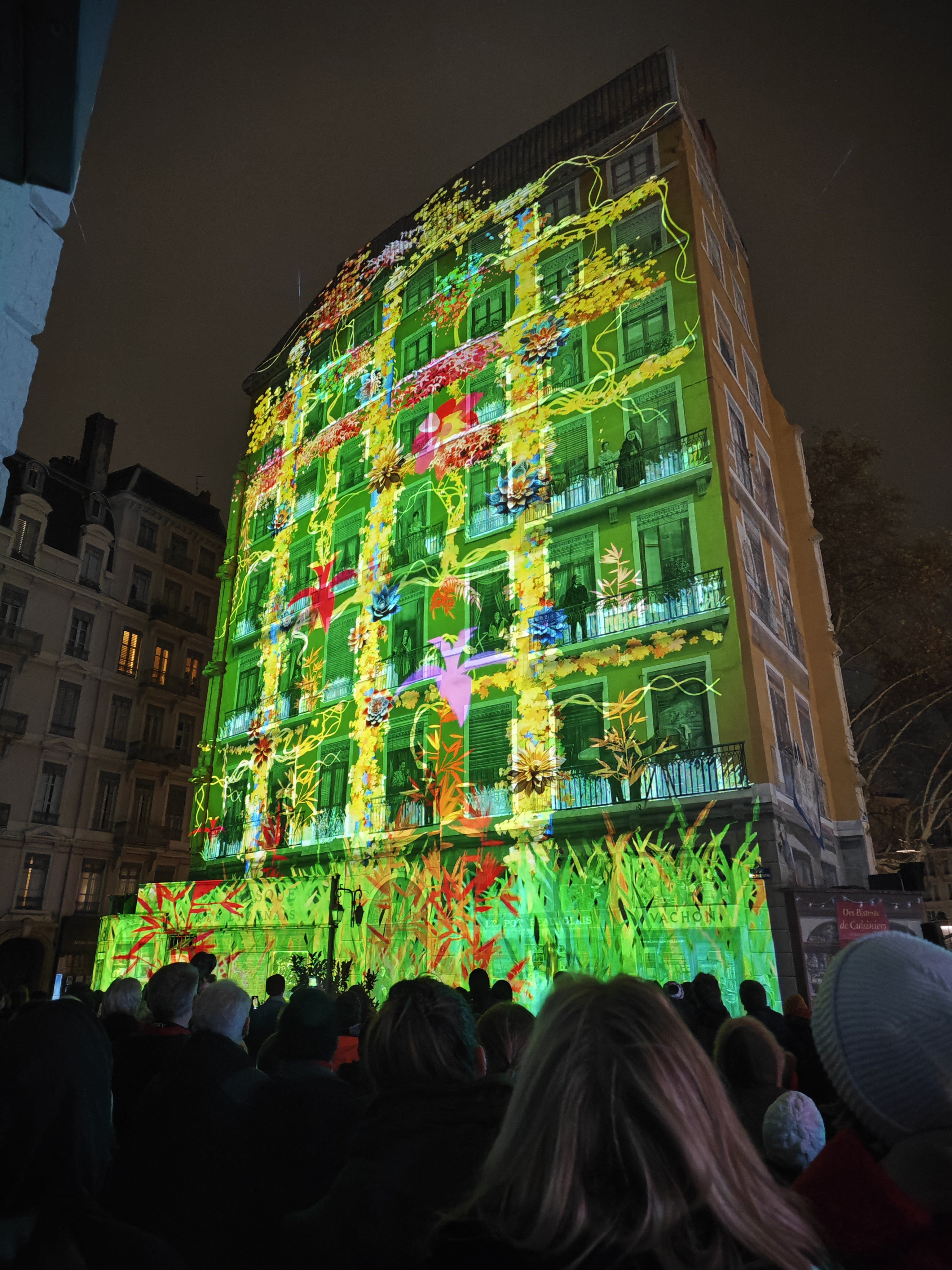 Très belle fresque de jour et une superbe animation qui met en avant le patrimoine lyonnais pour cette fête des lumières 2023