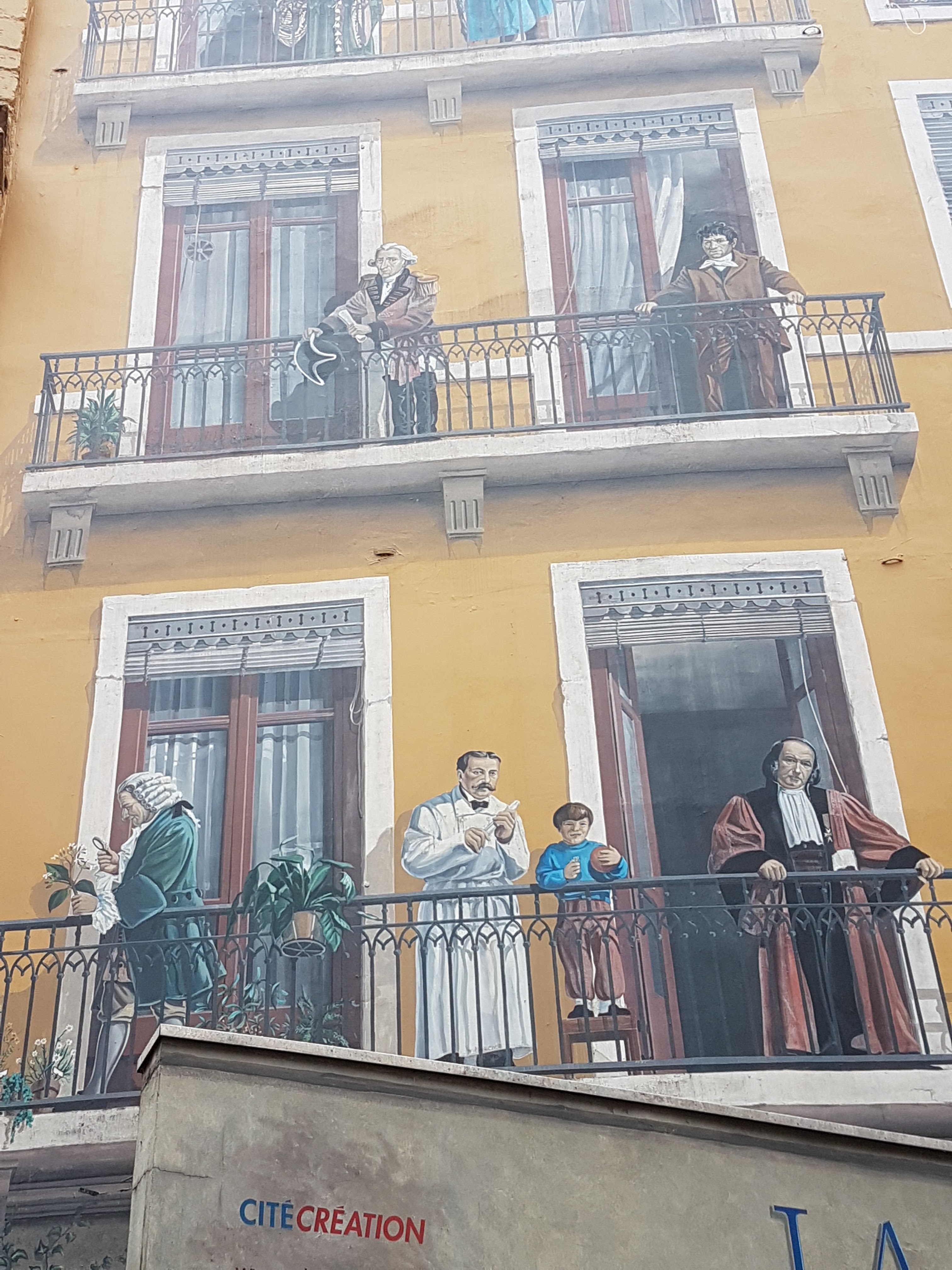 Très jolie façade peinte avec les personnages célèbres de Lyon