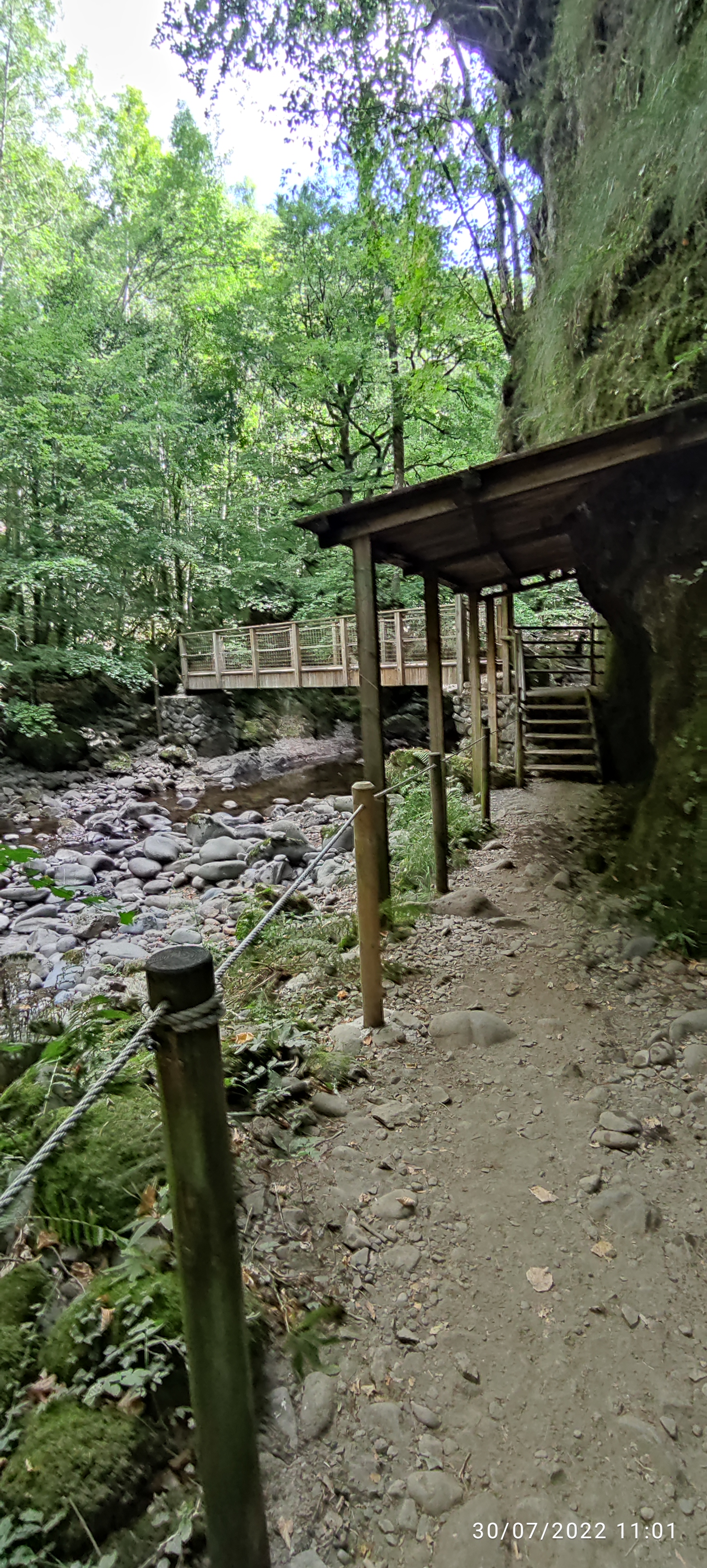 Sentier payant (4€/personne) caillouteux et très poussiéreux, jonché de pierres instables, racines et même grillage. 3.6 km AR, traverse une dizaine de passerelles et des escaliers parfois difficiles (marches hautes en planches de bois et terre). Chaussures de marche vivement recommandées. Ce trajet est creusé et entretenu uniquement par le foulage des centaines de touristes quotidiens et est -actuellement, août 2022- sans intérêt (rivière stagnante, plantes recouvertes de poussière et non entretenues, sous-bois sec)
