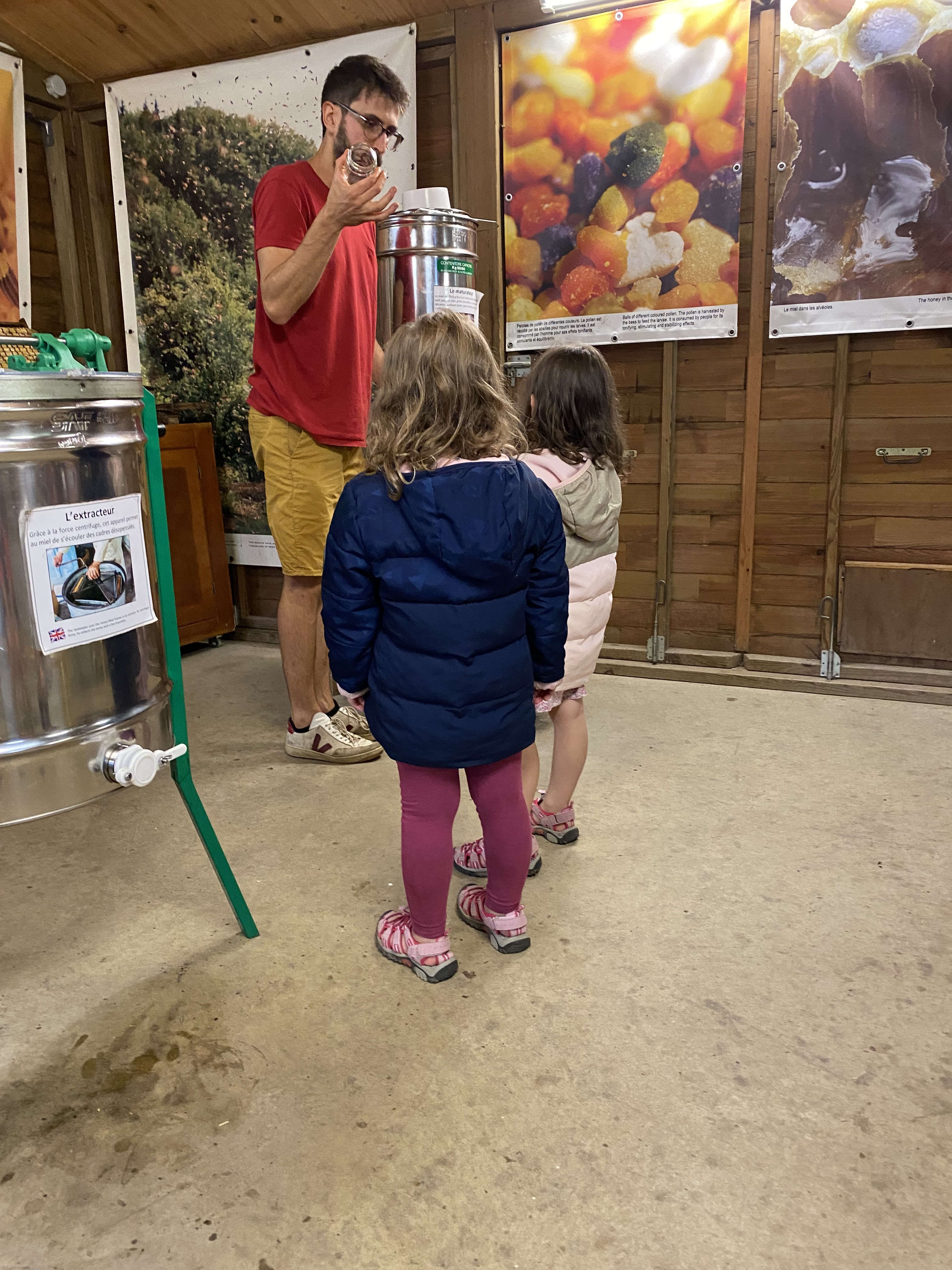 Journée du mercredi sur les abeilles avec animations pour les enfants, petit spectacle, découverte des ruches puis de la miellerie en compagnie de Clément. La boutique est top, du choix de miel de qualité sans lequel on ne peut repartir haha !!
