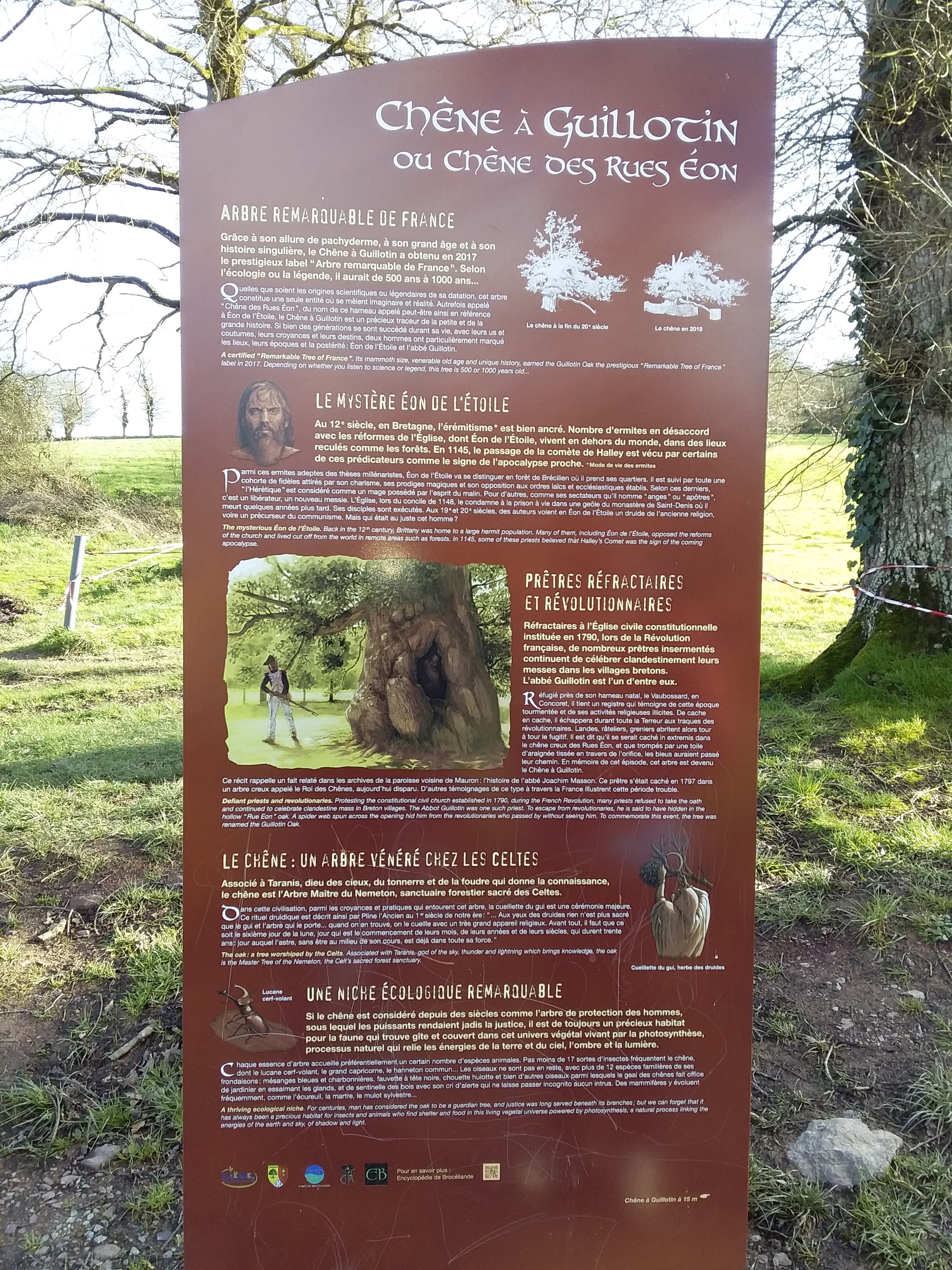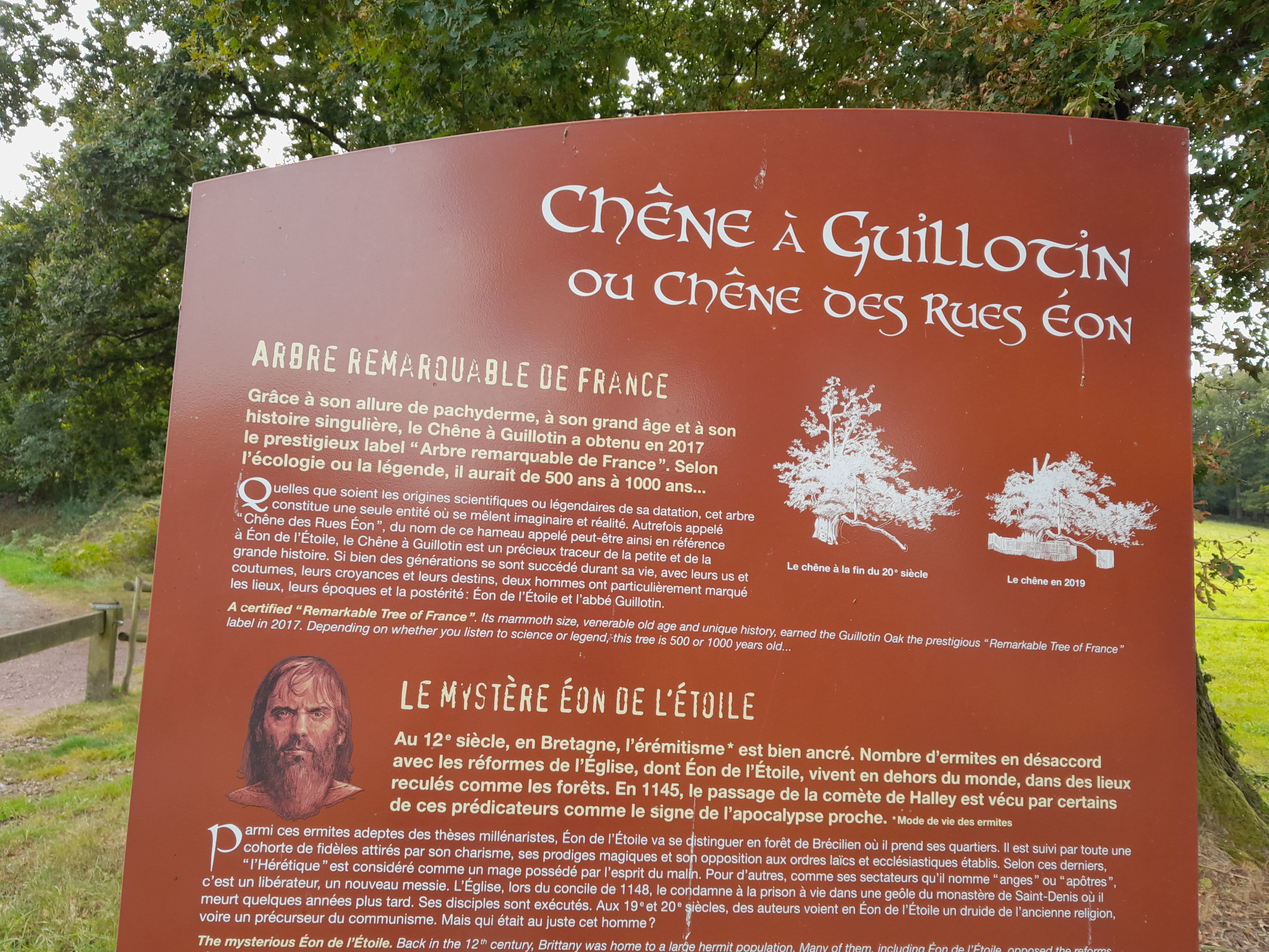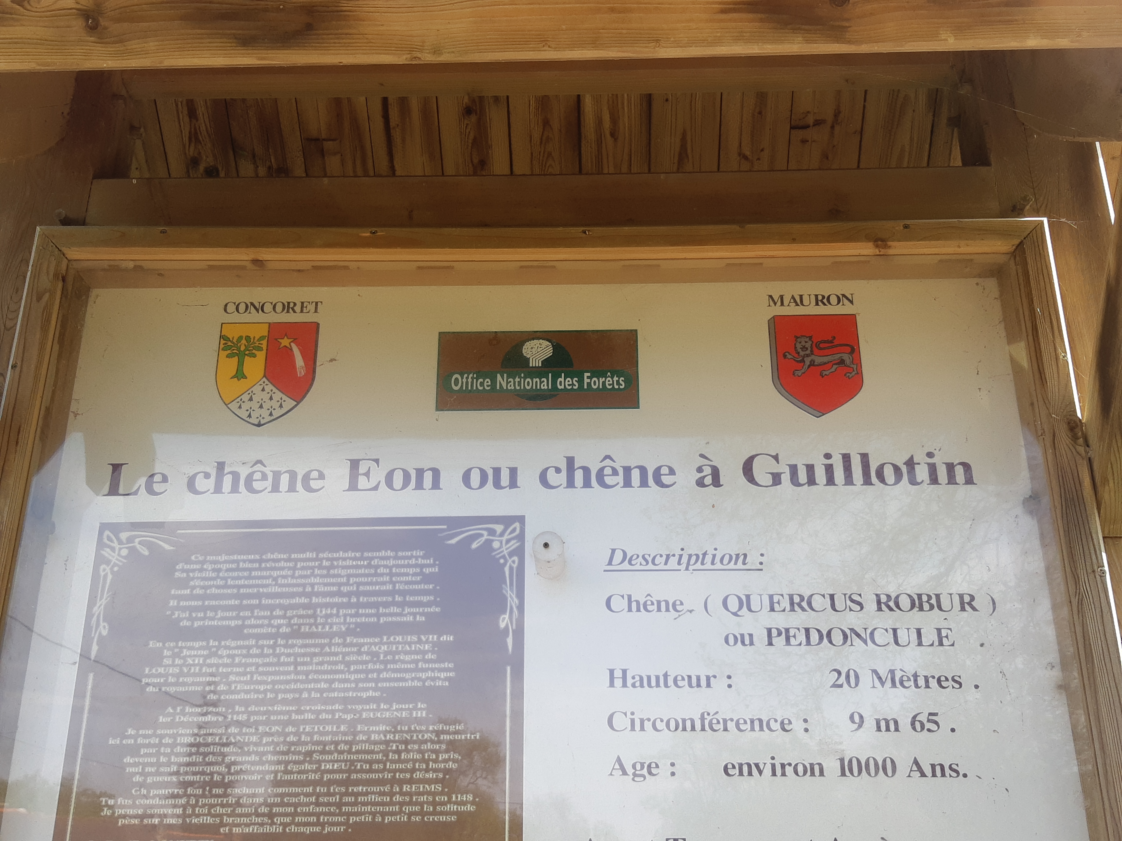 Hélas, ce chêne millénaire malgré un entretien régulier et des barrières de protection se dégrade de plus en plus au fil des années. Néanmoins encore très impressionnant avec ses 10 mètres de circonférence. Facile et rapide d'accès ce chêne de guillotine à proximité de Trehantoreuc, autre lieu lui par contre à découvrir avec son église, le val sans retour et beaucoup d'autres sites en Broceliande...