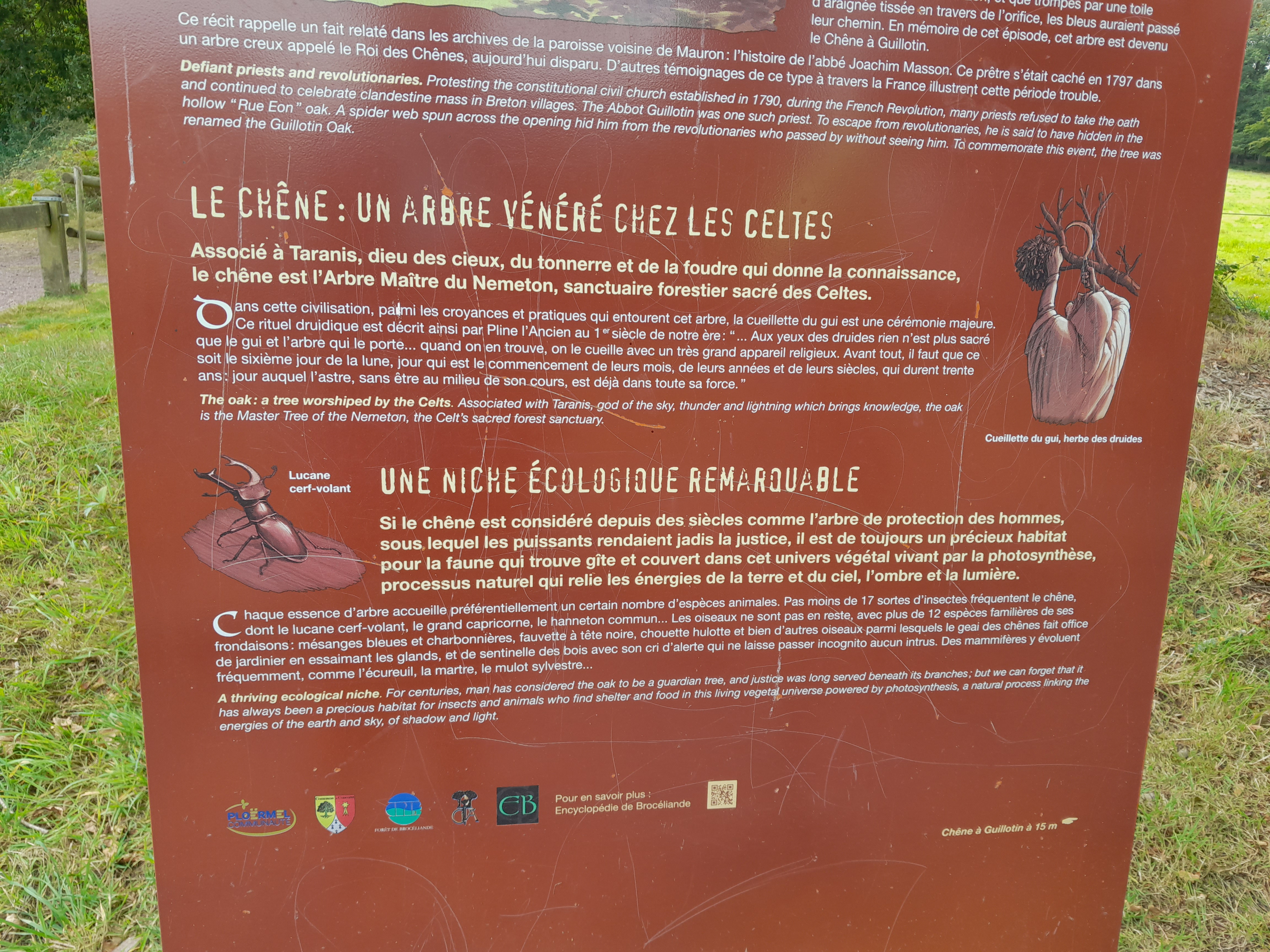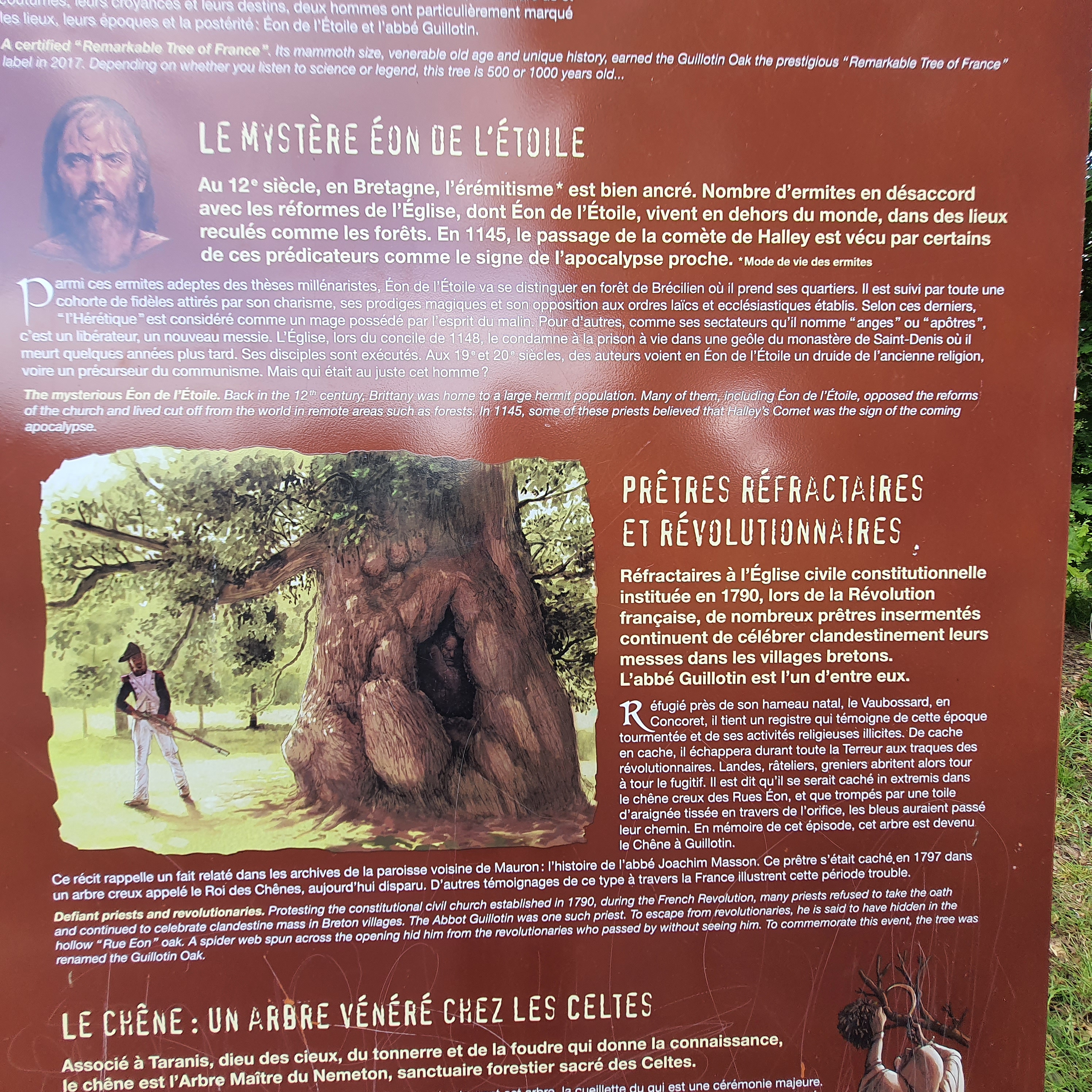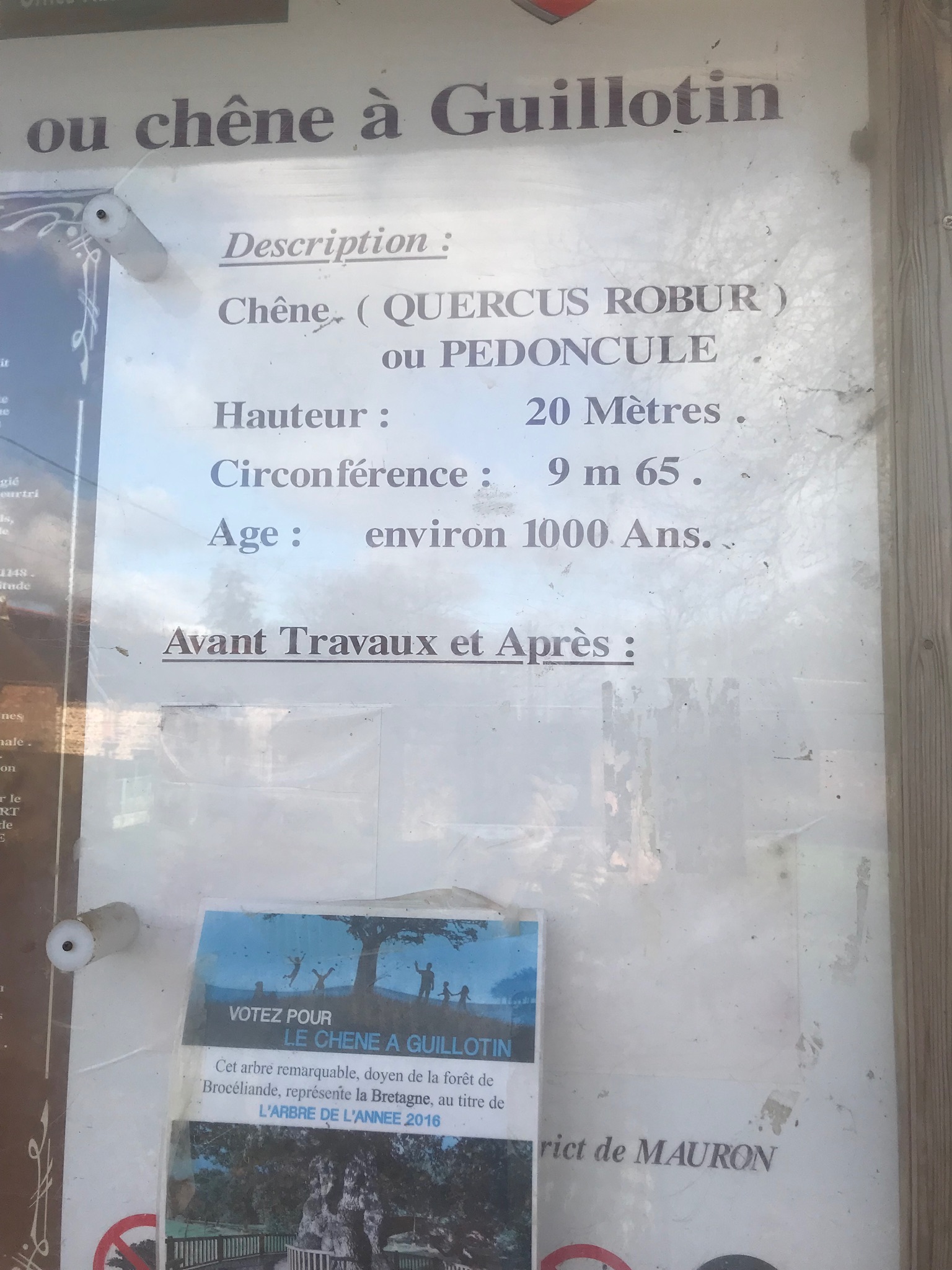 Hélas, ce chêne millénaire malgré un entretien régulier et des barrières de protection se dégrade de plus en plus au fil des années. Néanmoins encore très impressionnant avec ses 10 mètres de circonférence. Facile et rapide d'accès ce chêne de guillotine à proximité de Trehantoreuc, autre lieu lui par contre à découvrir avec son église, le val sans retour et beaucoup d'autres sites en Broceliande...