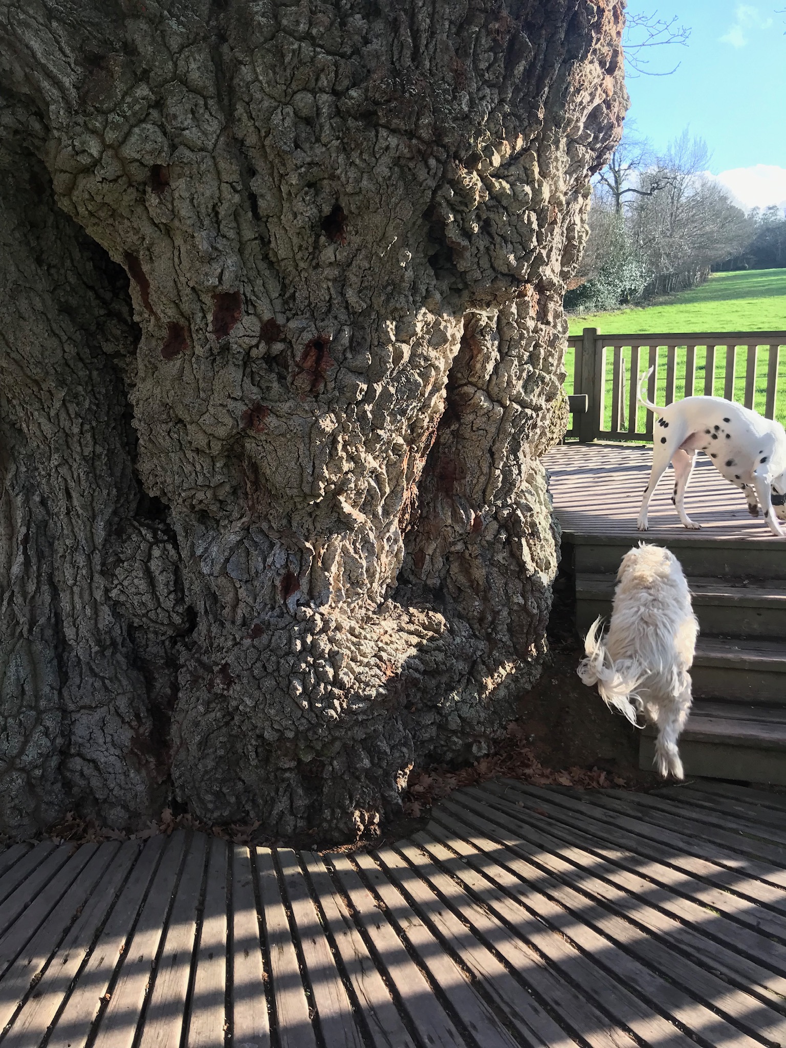 Cet arbre a l’air d’être en protection en ce moment. La grande terrasse en bois tout autour du vieux chêne est supprimé à présent. Il y a eu des coupes de grosses branches. J’espère qu’il va bien repousser.