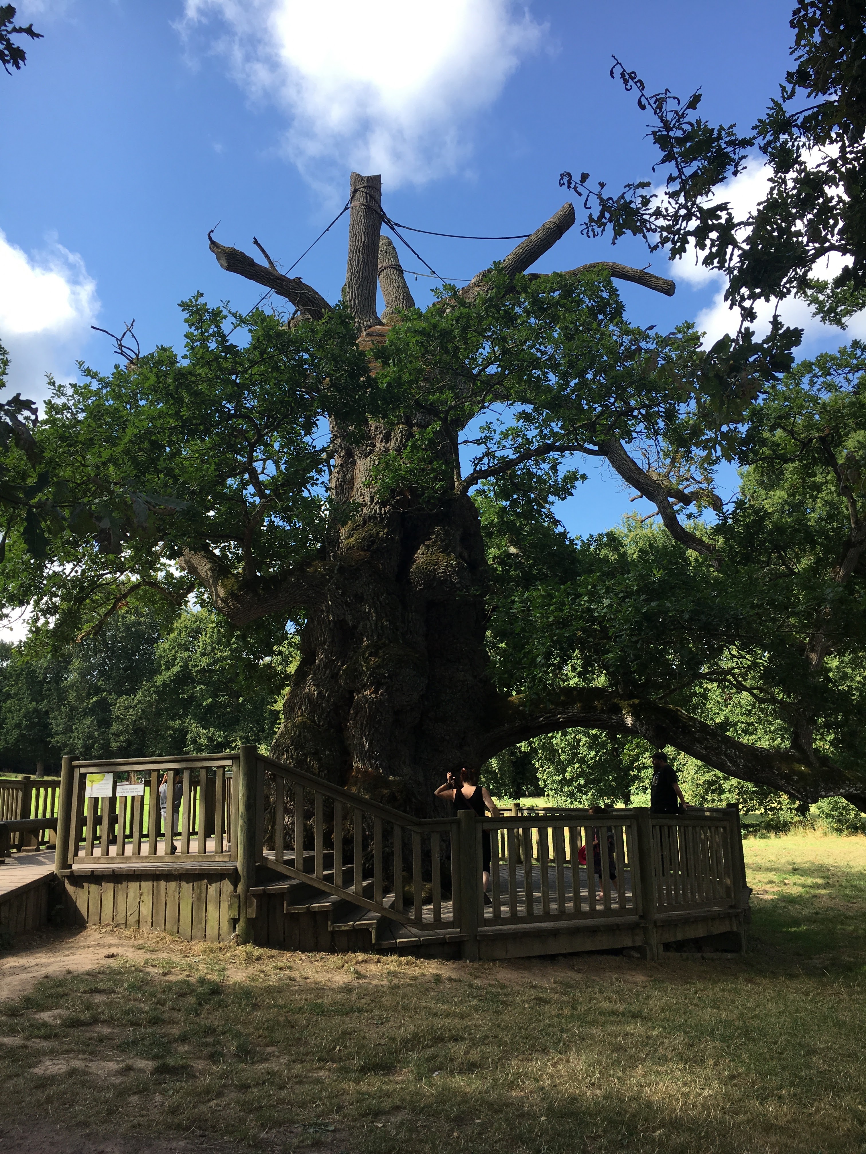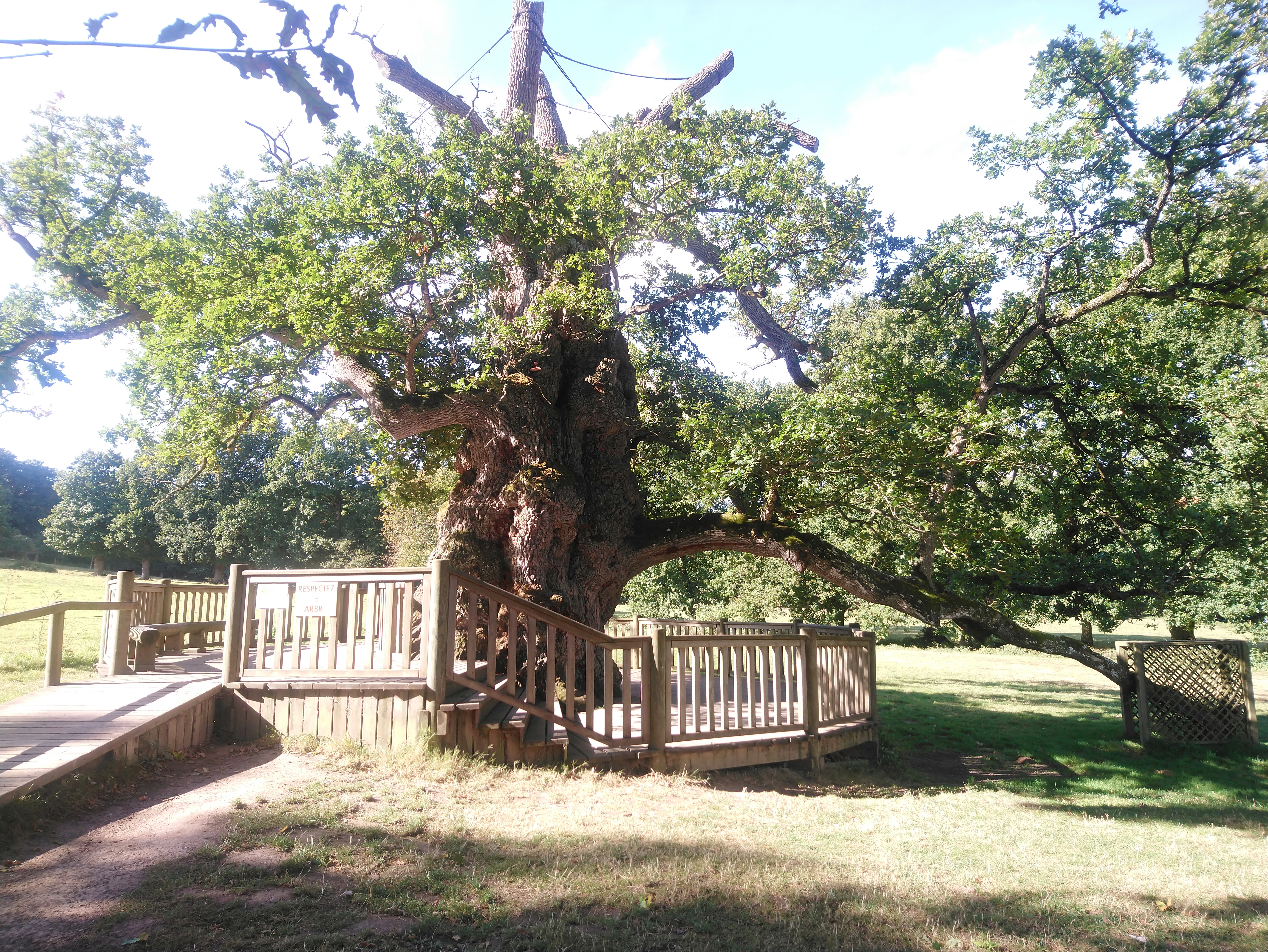 Déçue de constater que la belle passerelle nous permettant autrefois de faire le tour de ce magnifique chêne et d'admirer l'intérieur de celui-ci à été retiré sans explication... Et remplacée par des barrières sans âme loin de lui...