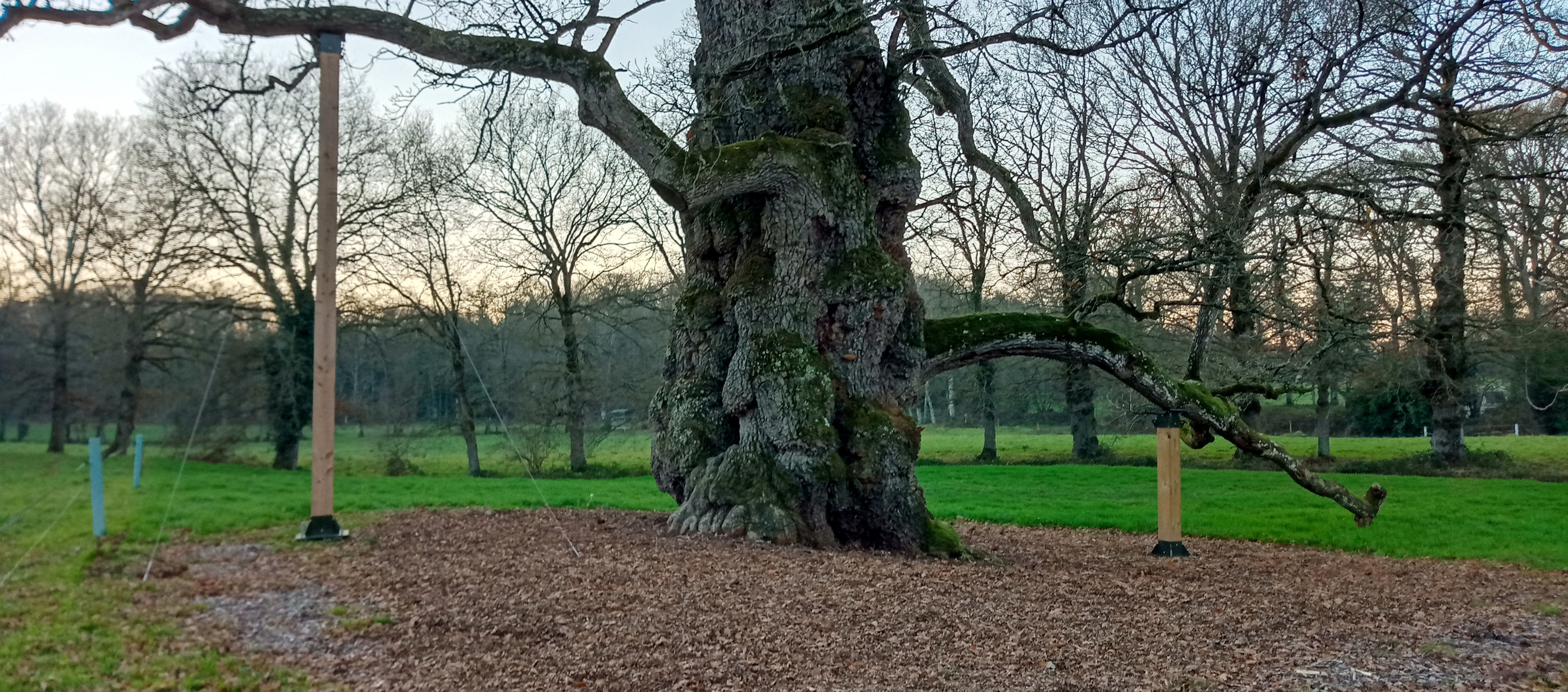 Le chêne est très fragile donc ils ont enlevé tous ce qui était installé autour. Il a une grosse branche maintenue pour l'empêcher de se casser. Ils ont mis une barrière juste à la hauteur des marches pour y accéder, et ils ont rajouté un grand panneau explicatif. Mais on ne peut plus lui donner notre énergie puisqu'on ne peut plus le toucher. Pour moi qui fait de la sylvothérapie, je trouve ça dommage de laisser cet arbre majestueux mourir.