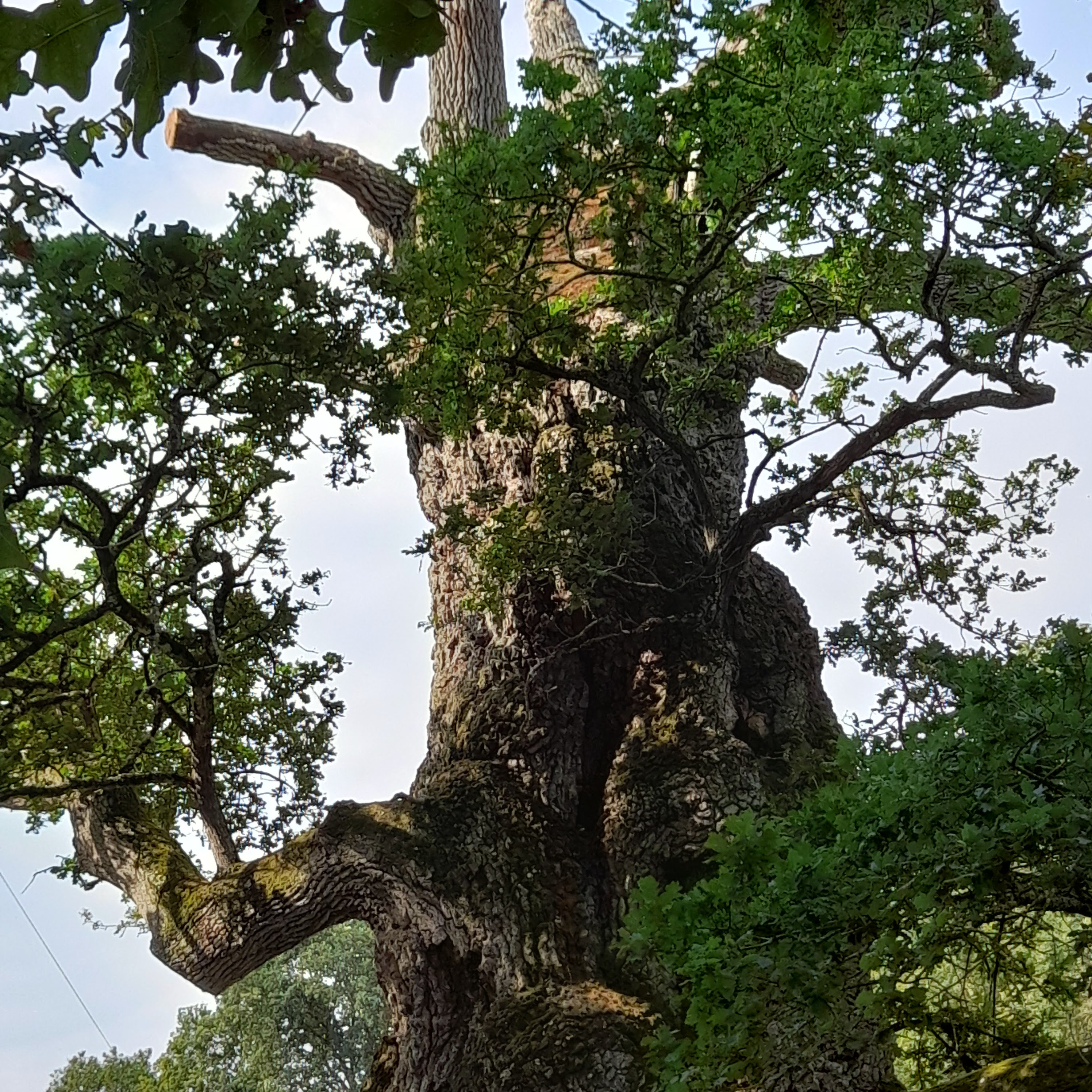 Magnifique chêne. Avec un tronc somptueux. Dommage que le temps a eut raison des branches principales. Les branches latérales sont toujours présentes bien que soutenues.