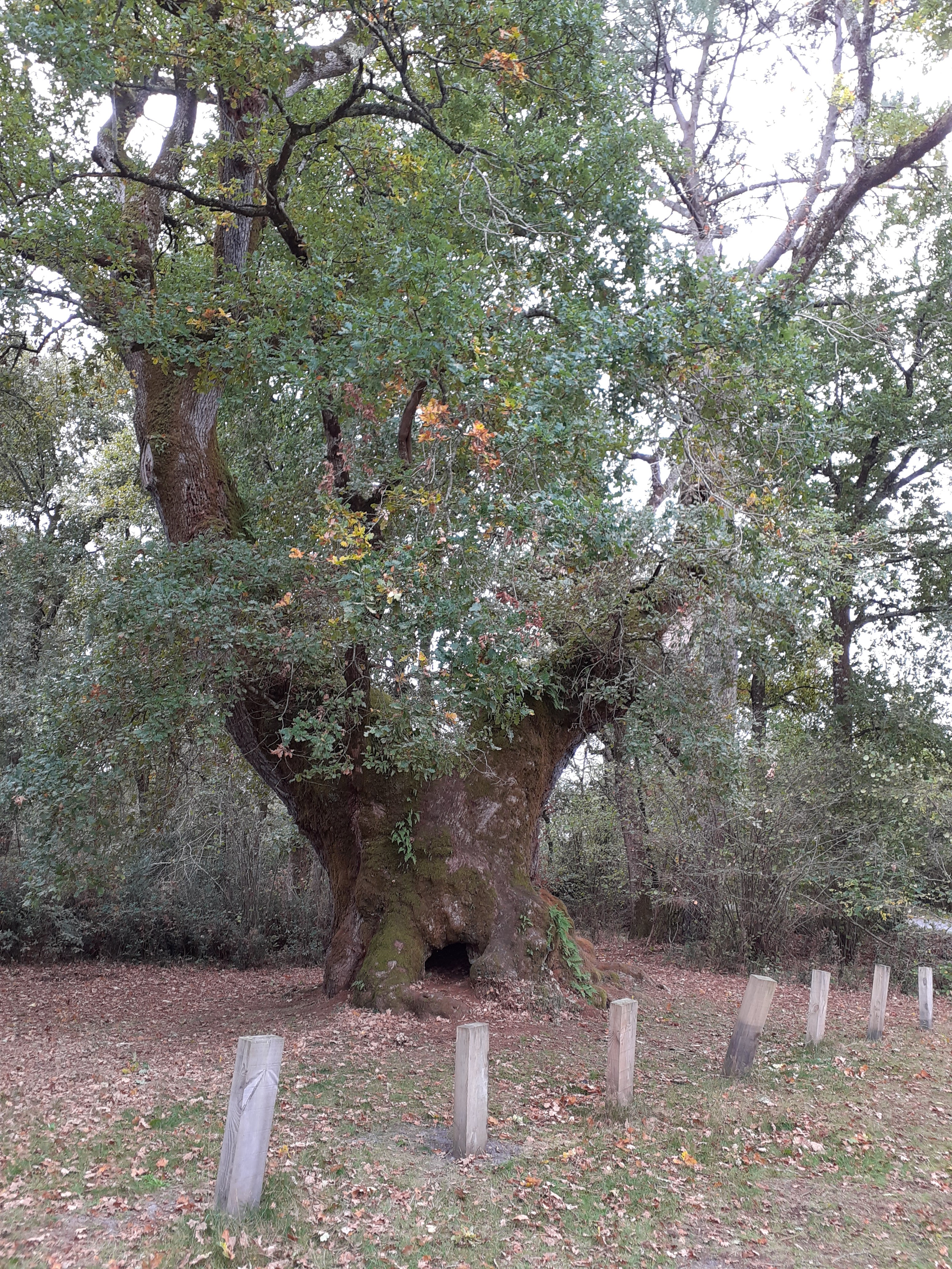Chêne magnifique, on a l'impression qu'il y a 2 arbres qui s'enroule l'un autour de l'autre. Le milieu est creux, on peut y rentrer par la base et ressortir en haut du tronc, pour certains cela évoque une nouvelle naissance. Autrement cet arbre dégage une atmosphère de calme.
