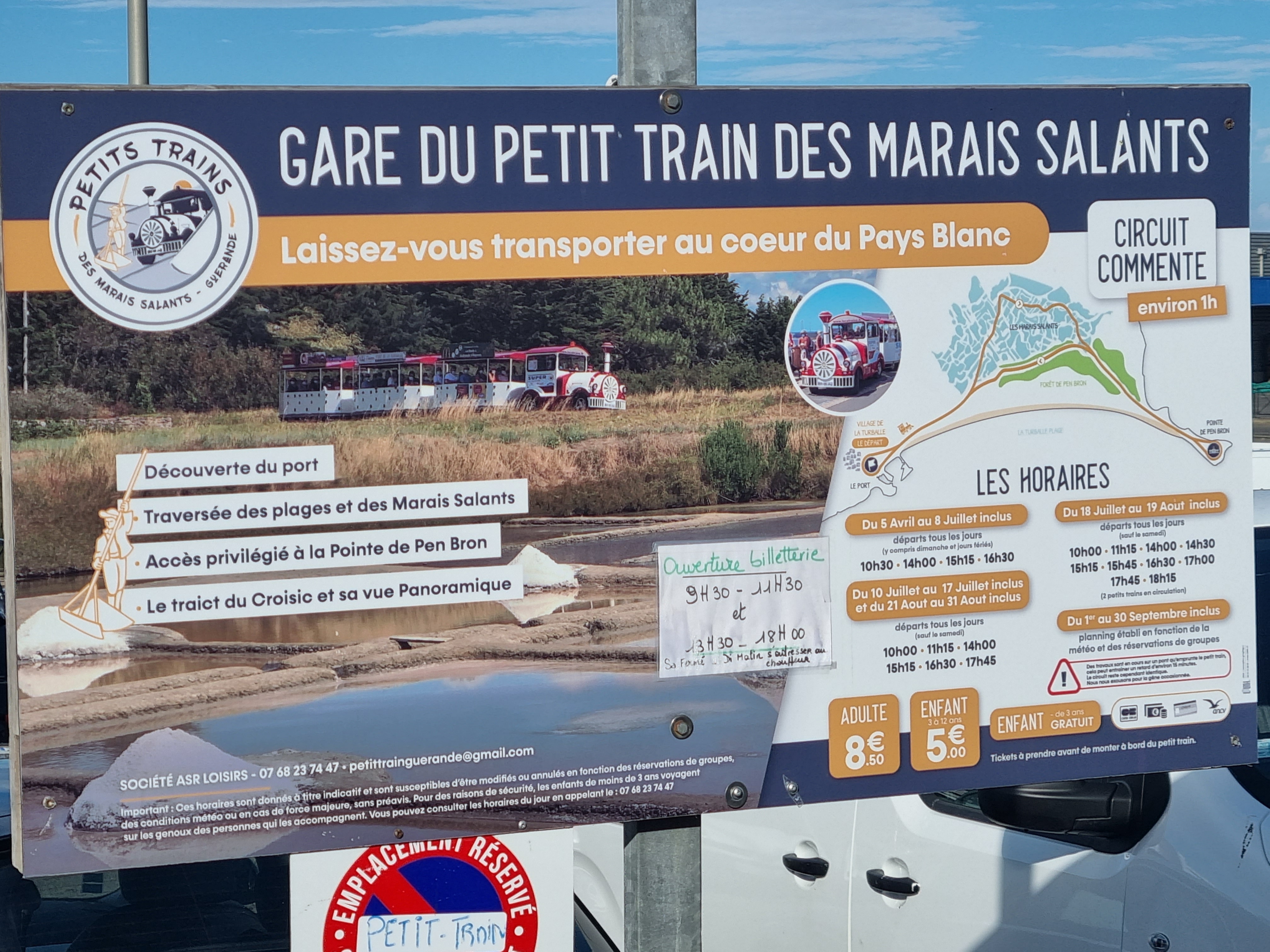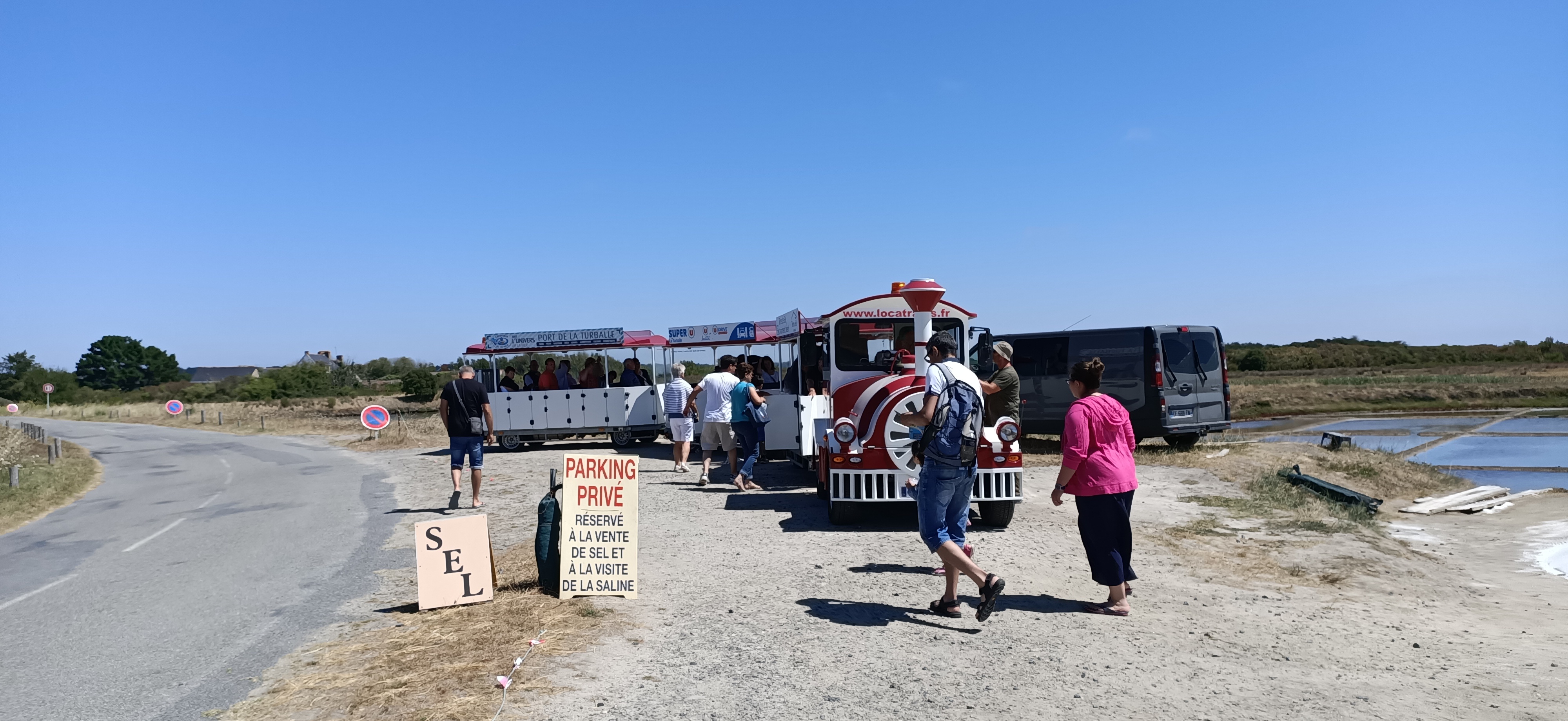 J'ai appelé la veille pour réserver, une charmante personne me dit que ce n'est pas la peine de réserver, et que les billets s'achetent directement auprès du machiniste...Le jour j nous arrivons 15mn avant le départ du train, beaucoup de monde attend, et tout le monde ne pourra pas monter...Comme toujours des gens ne font pas la queue ou se précipitent pour prendre place ds le train... Je demande donc au machiniste de me vendre les billets pour le tour suivant ce qu'il refuse prétextant que s'il commence à vendre les billets il ne pourra pas partir !!!! Souvent pour ce genre de chose les billets sont en vente à l'office de tourisme, ce qui évite ce genre de désagréments. Bref, nous sommes 3 et il restait 3 places mais séparées. Nous décidons tout de même de faire la ballade qui finalement n'a pas grand intérêt, il passe par des endroits accessibles en voiture, à travers les marais. Arrêt de quelques minutes auprès d'un paludier qui en 5 minutes vous explique le concept de la récolte du sel et vous propose évidemment d'acheter sa production... La musique à bord du train est insupportable il serait plus intéressant de mettre de la musique bretonne... Et enfin nous sommes informés du passage devant le camping et le vvf !!!! Super ! Aucun intérêt.
