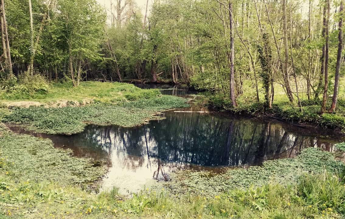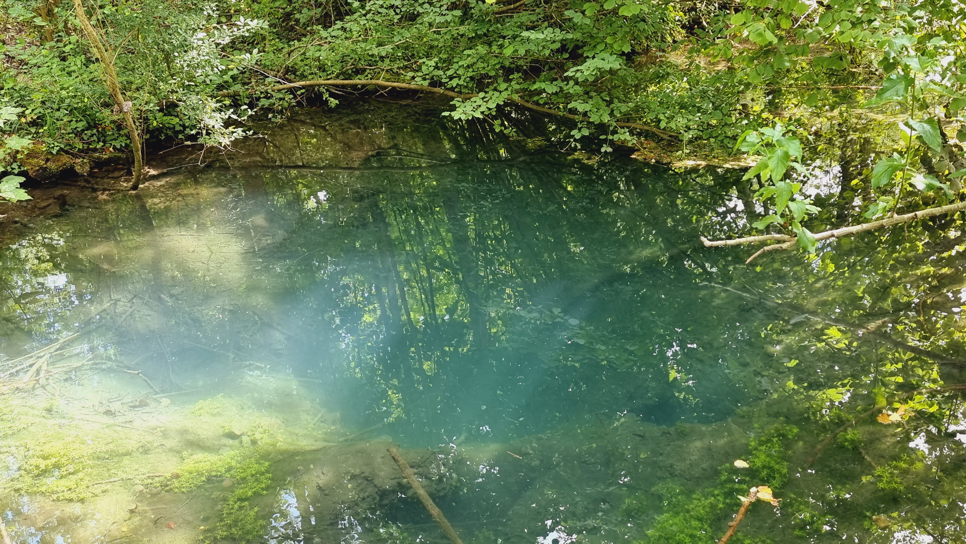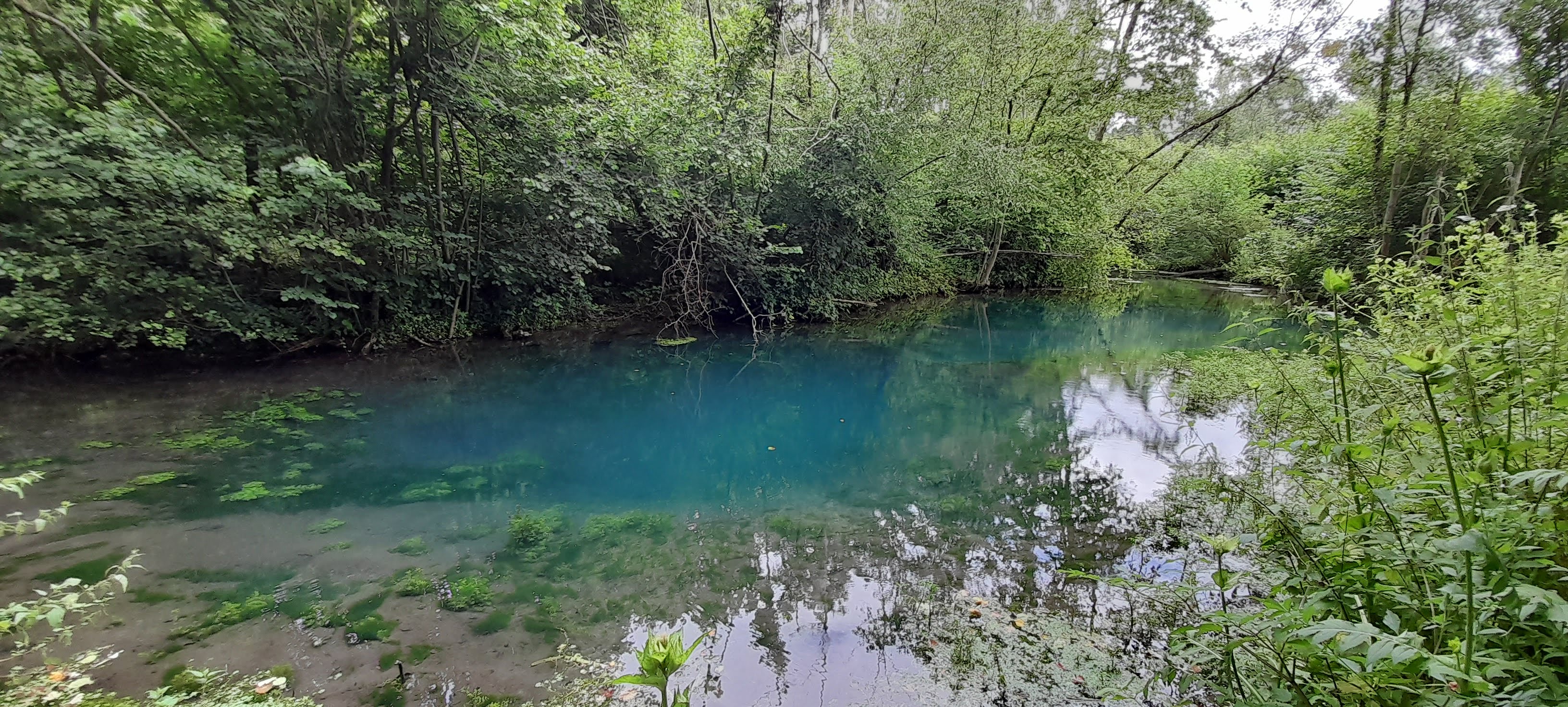 Une belle promenade est à faire sous les arbres le long d'une rivière à l'eau bleutée qui nous laisse découvrir, à différents endroits, les creux formés au fond de l'eau par les fameux puits tournants.