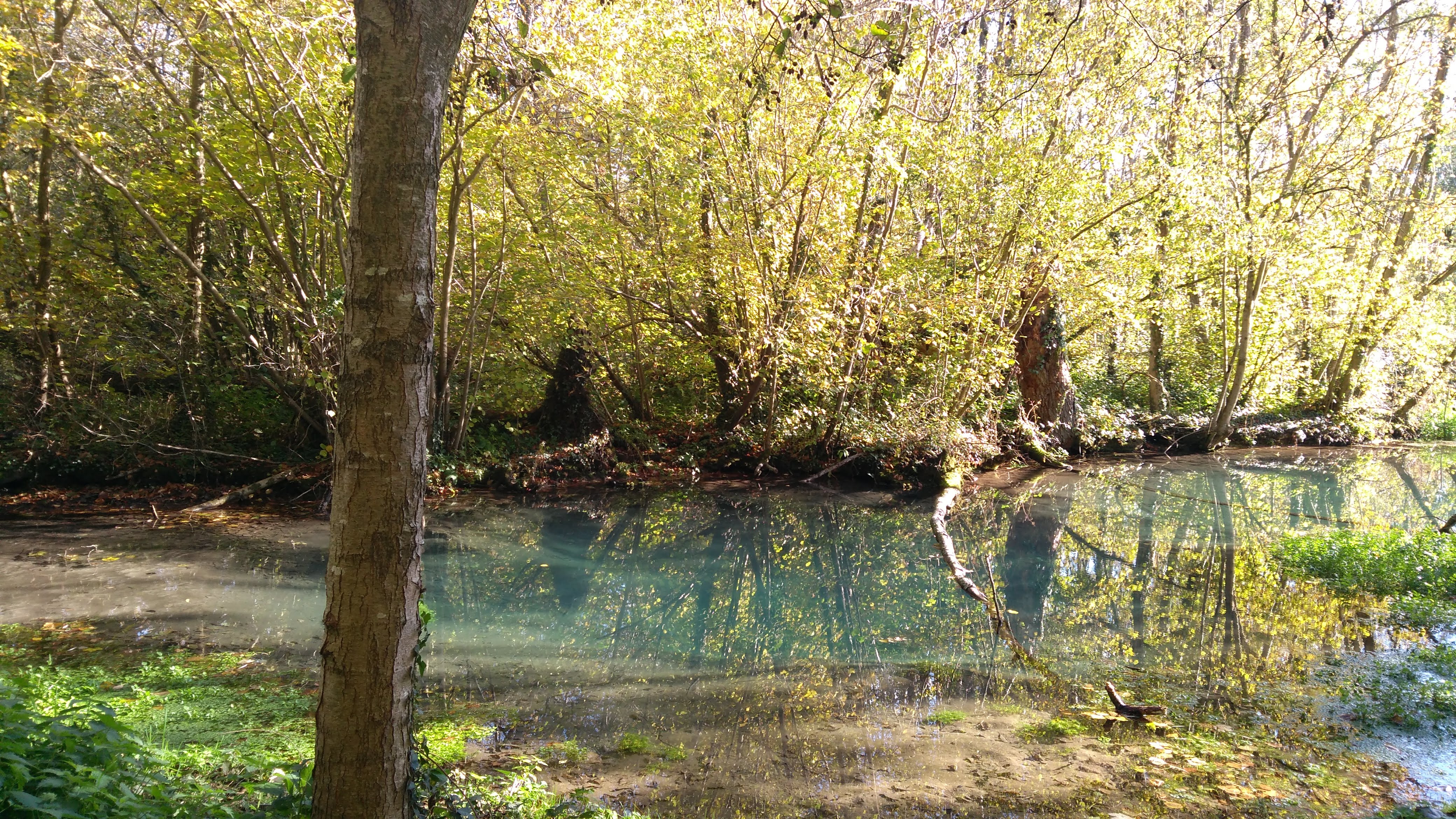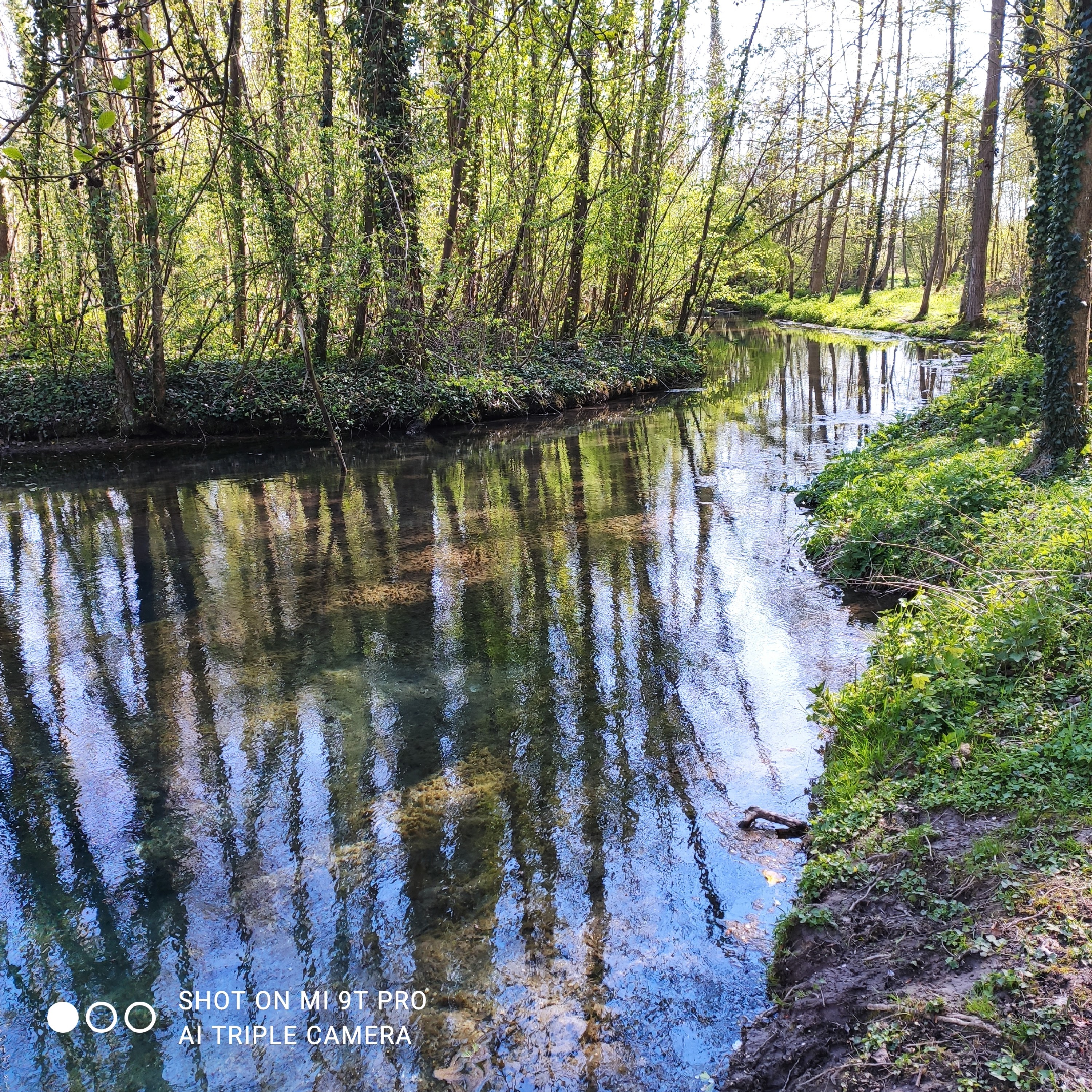 Petit ruisseau avec des reflets bleus le long d'un sentier, petite balade agréable sous les arbres. Très peu connu mais dans le petit village de Fréchencourt.