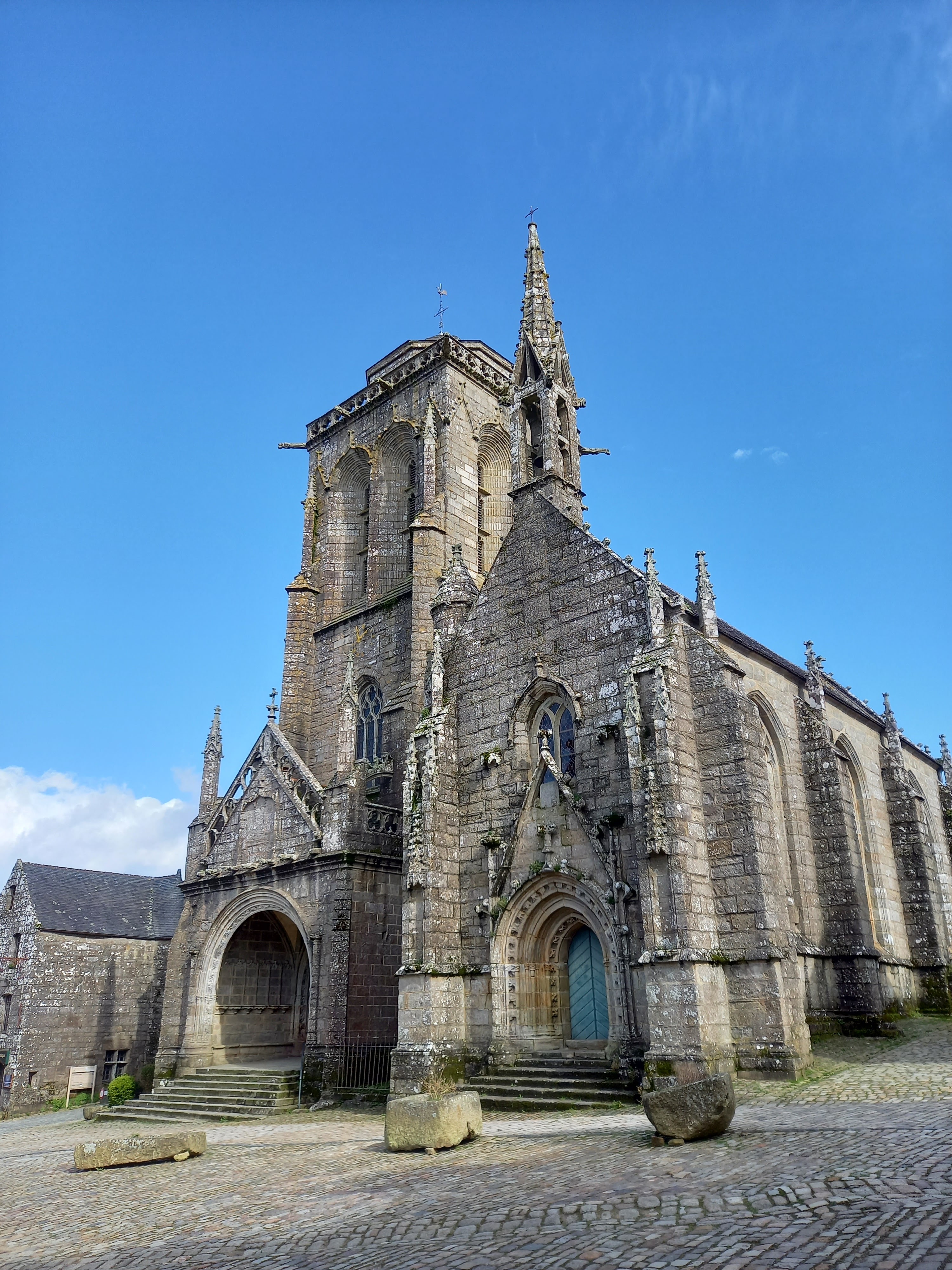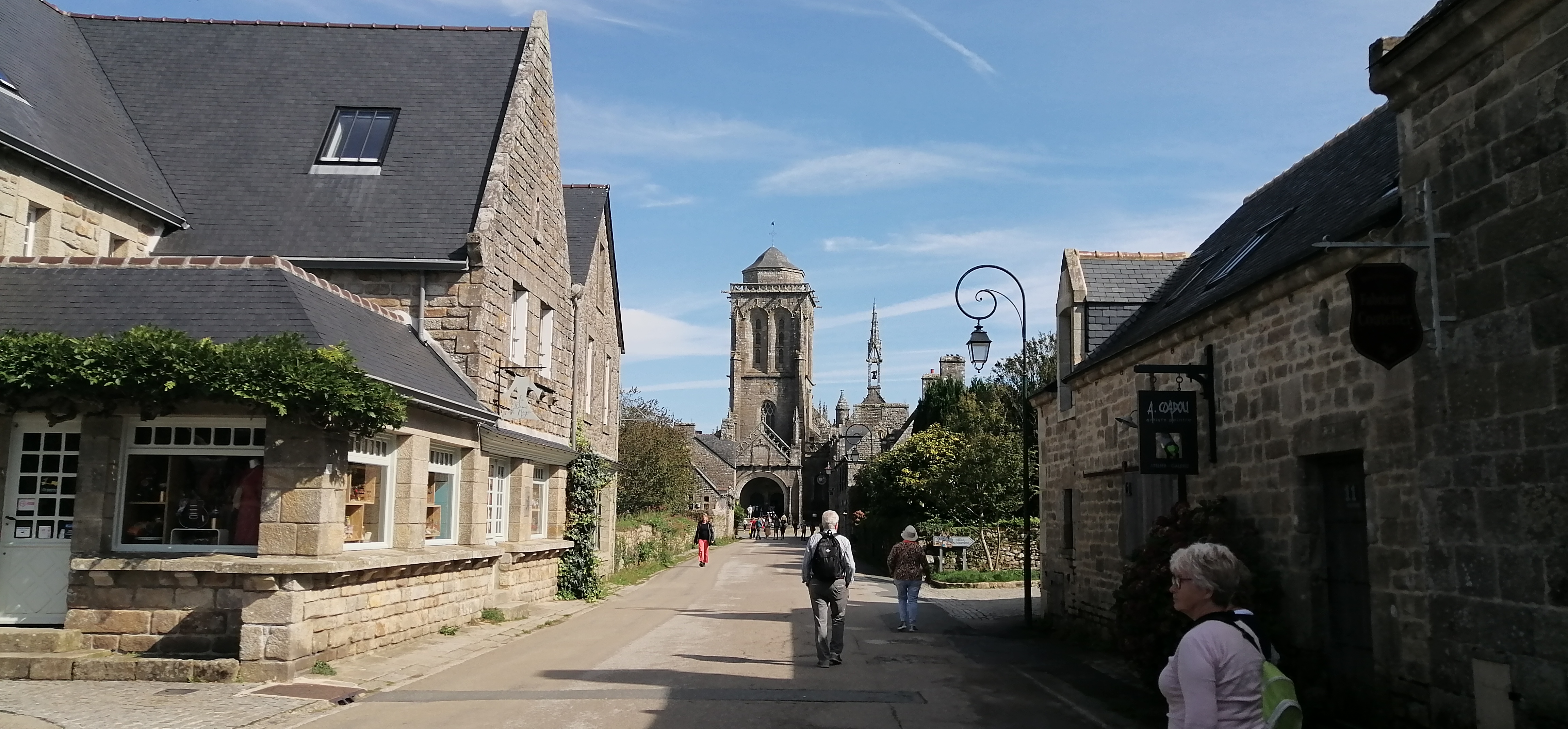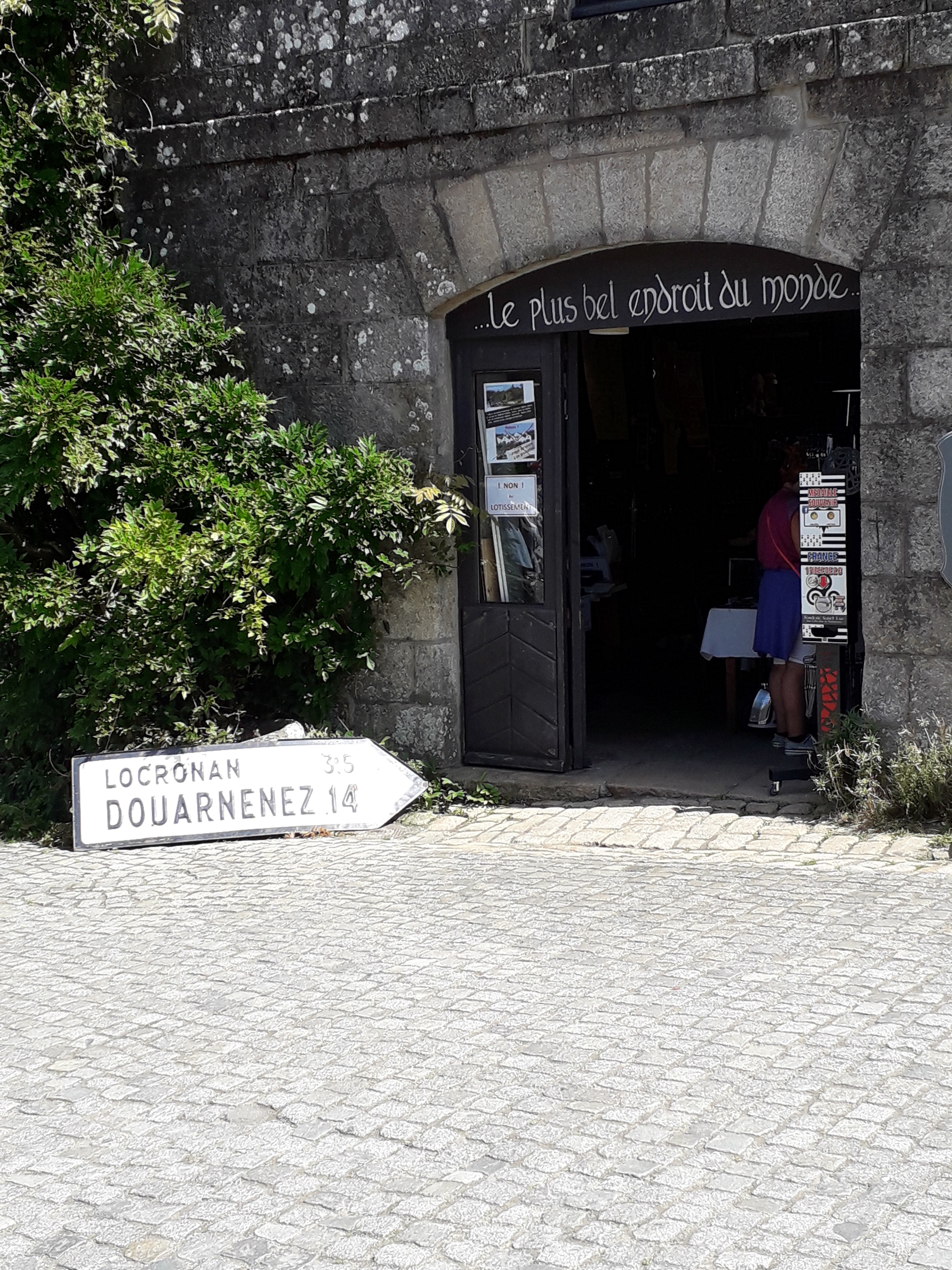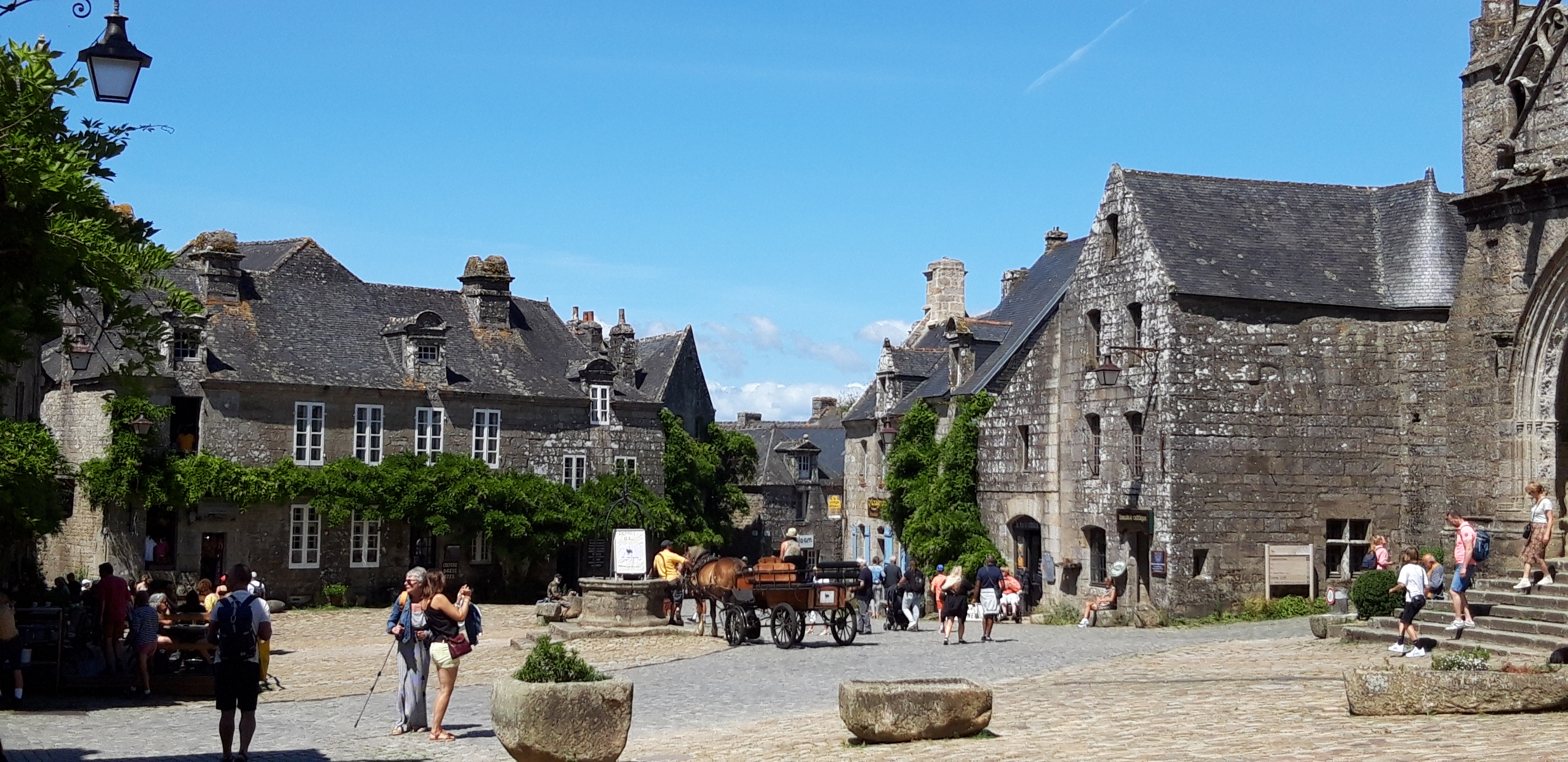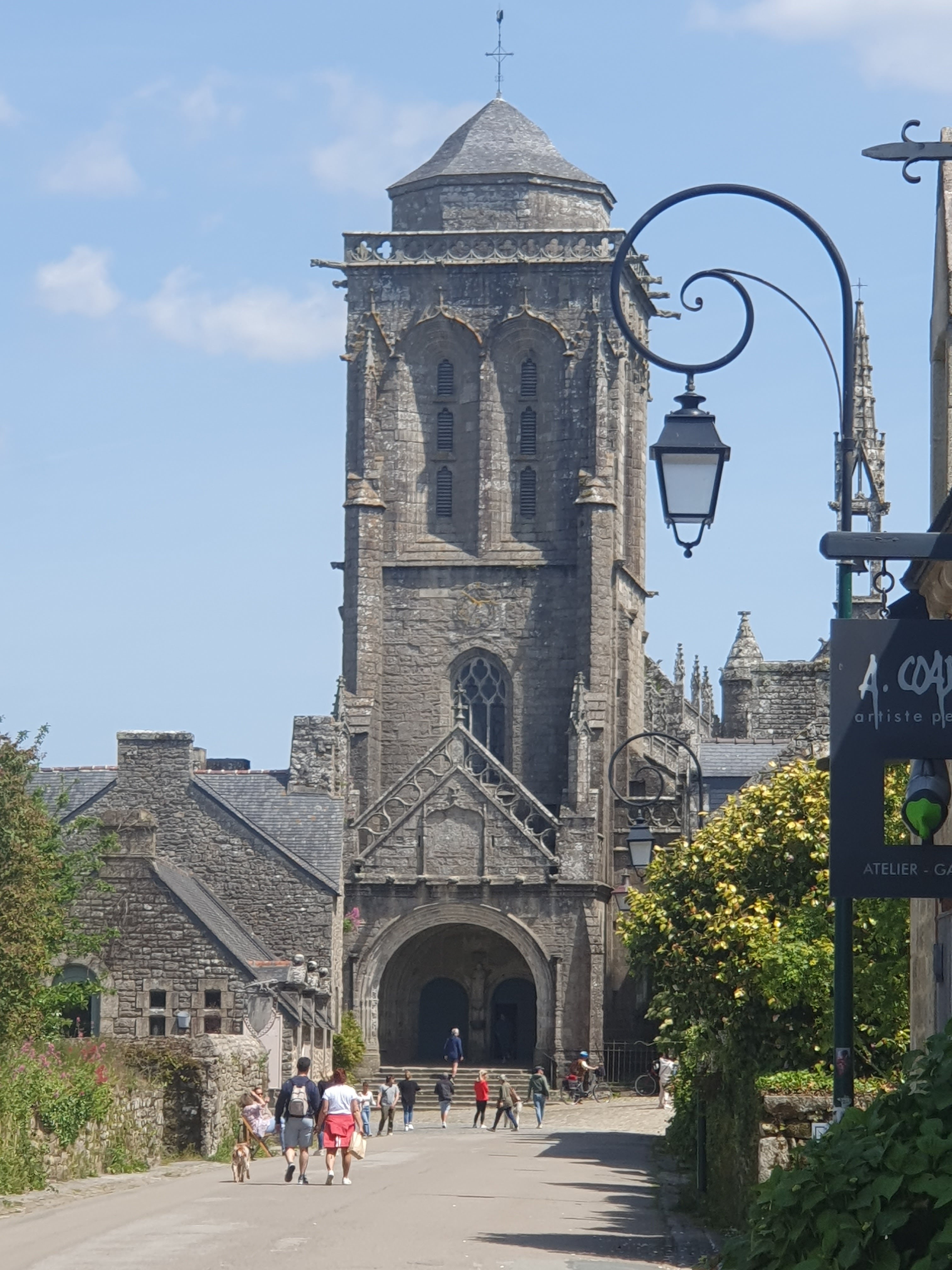 Visite du village historique de Locronan. C'est un village magnifique, bien que peut-être un peu moins charmant que Rochefort-en-Terre. Hier, il y avait un peu trop de monde malgré la période, comparé à d'autres endroits en Bretagne en ce moment. Le personnel de l'office du tourisme était très compétent et accueillant, tout comme les commerçants du village. L'église est vraiment superbe. Même le Crédit Agricole a réussi à se fondre dans le décor dans une ancienne maison pour son distributeur de billets.