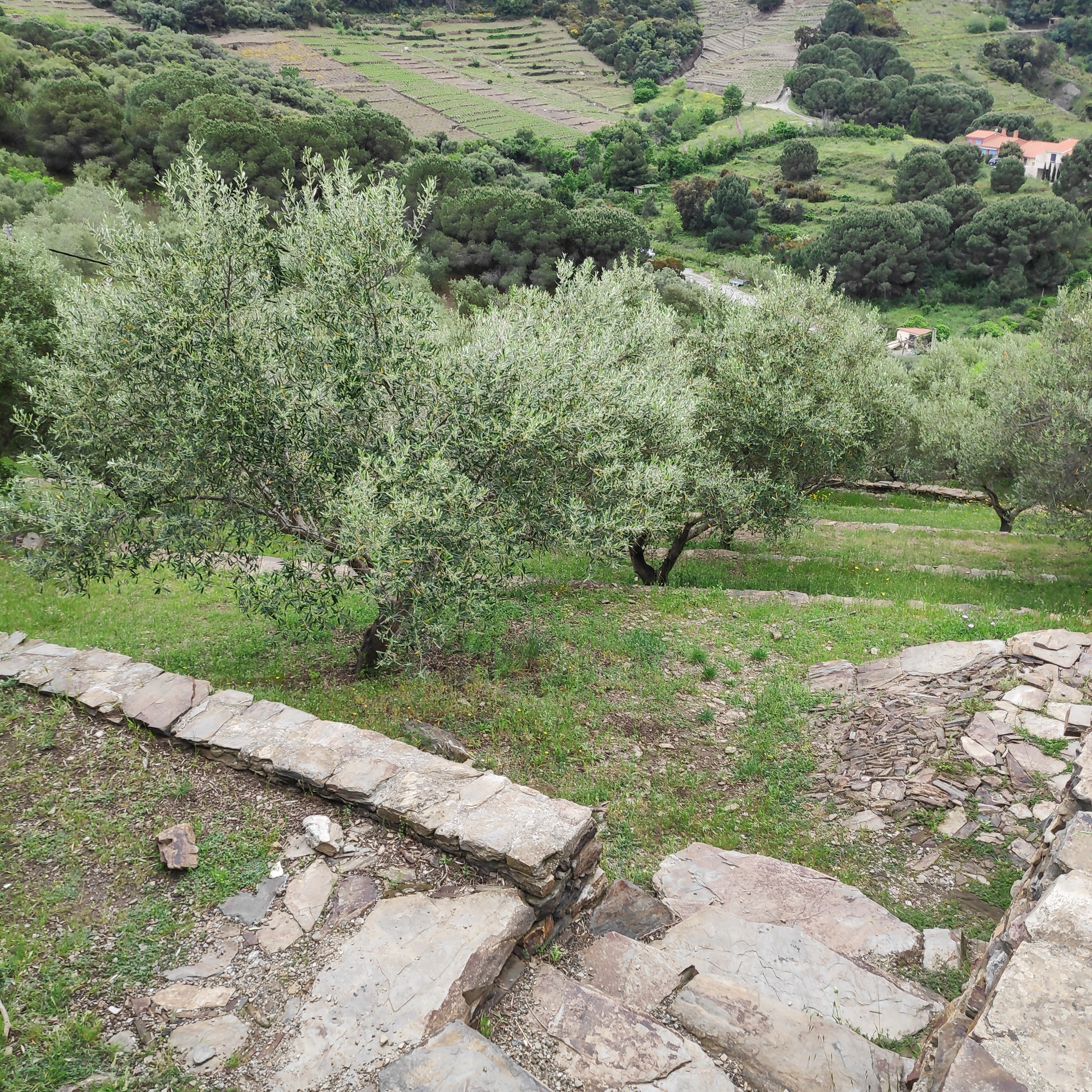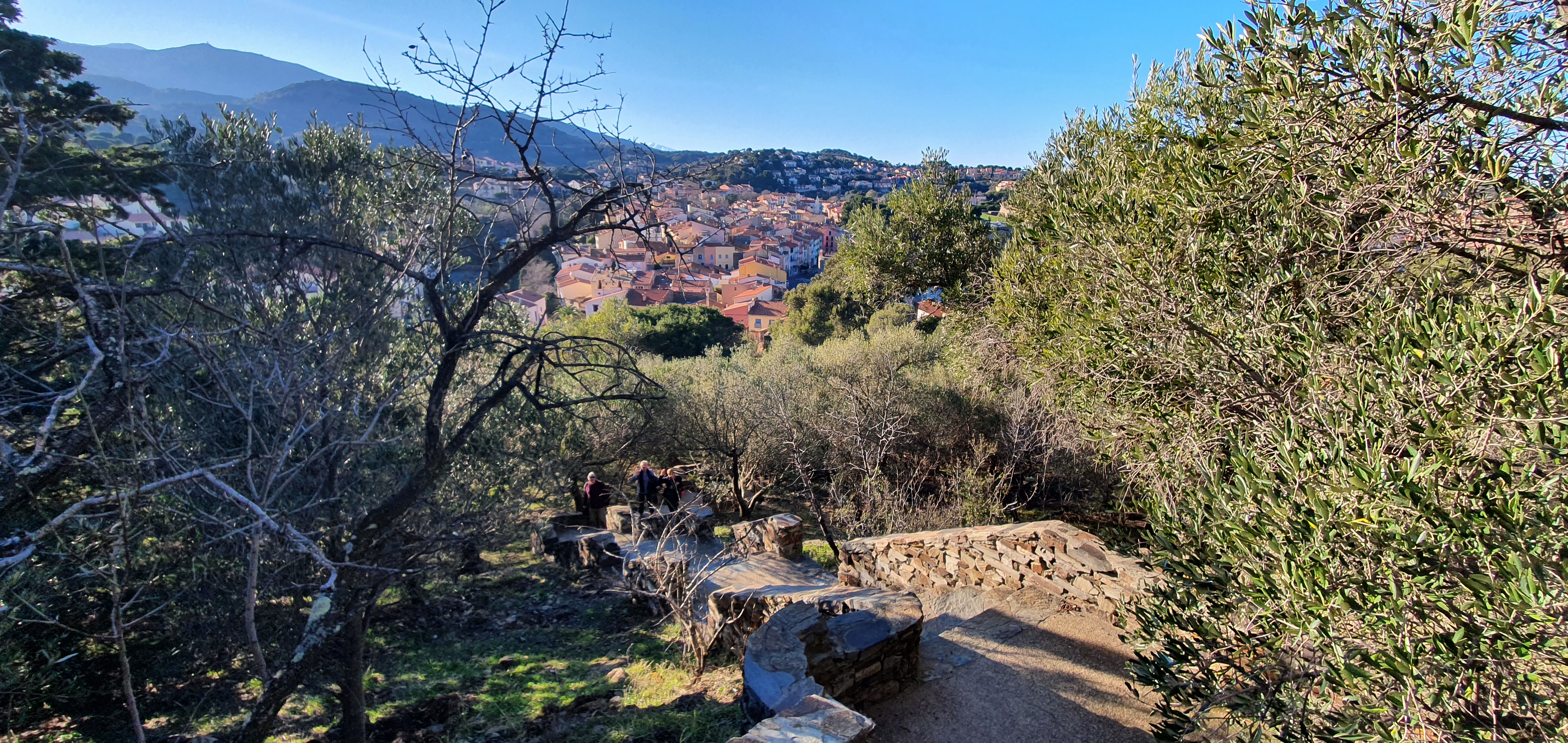 Montée parmi les oliviers et amandiers en terrasses de murets de schistes, récompensée par une superbe vue sur la baie de Collioure.