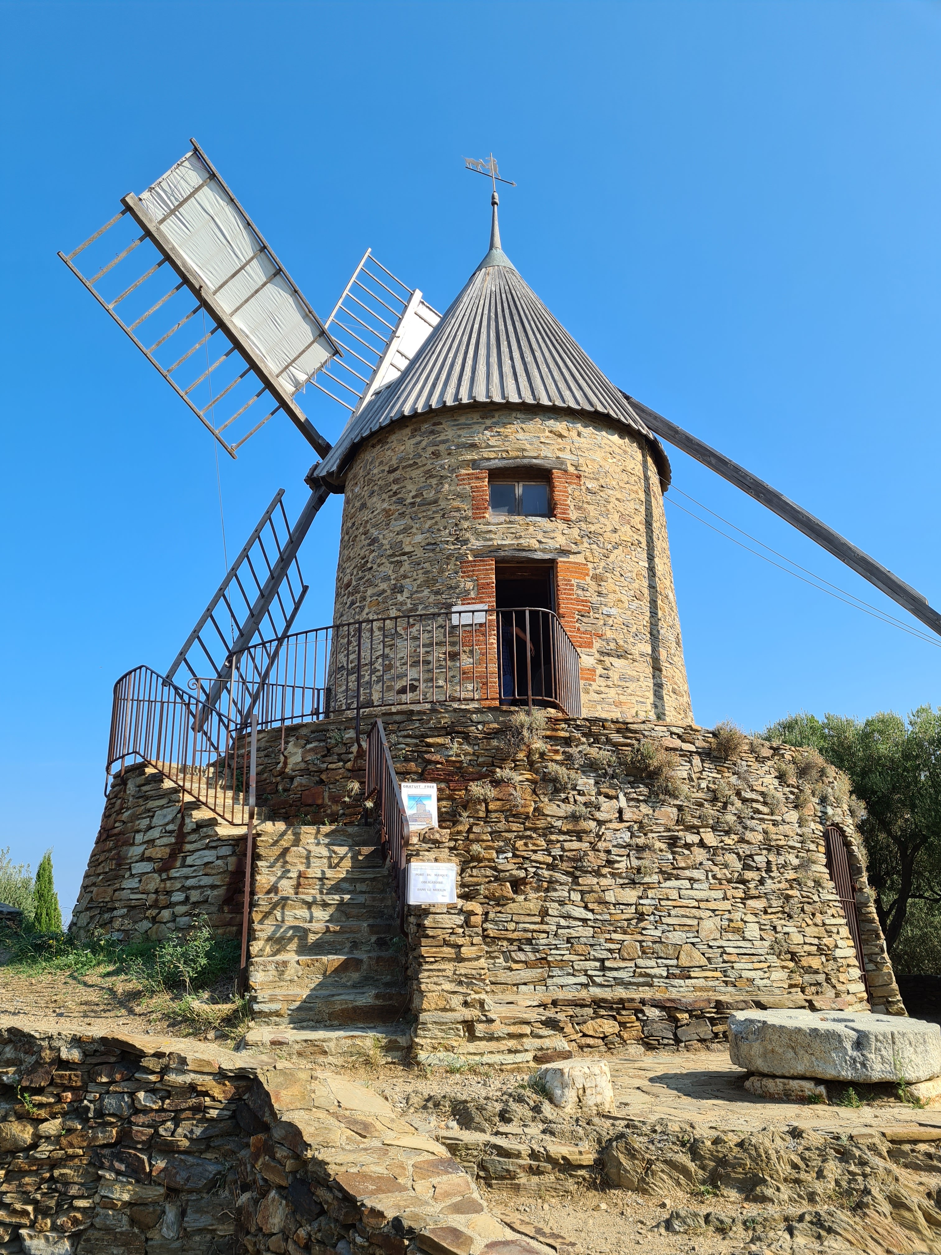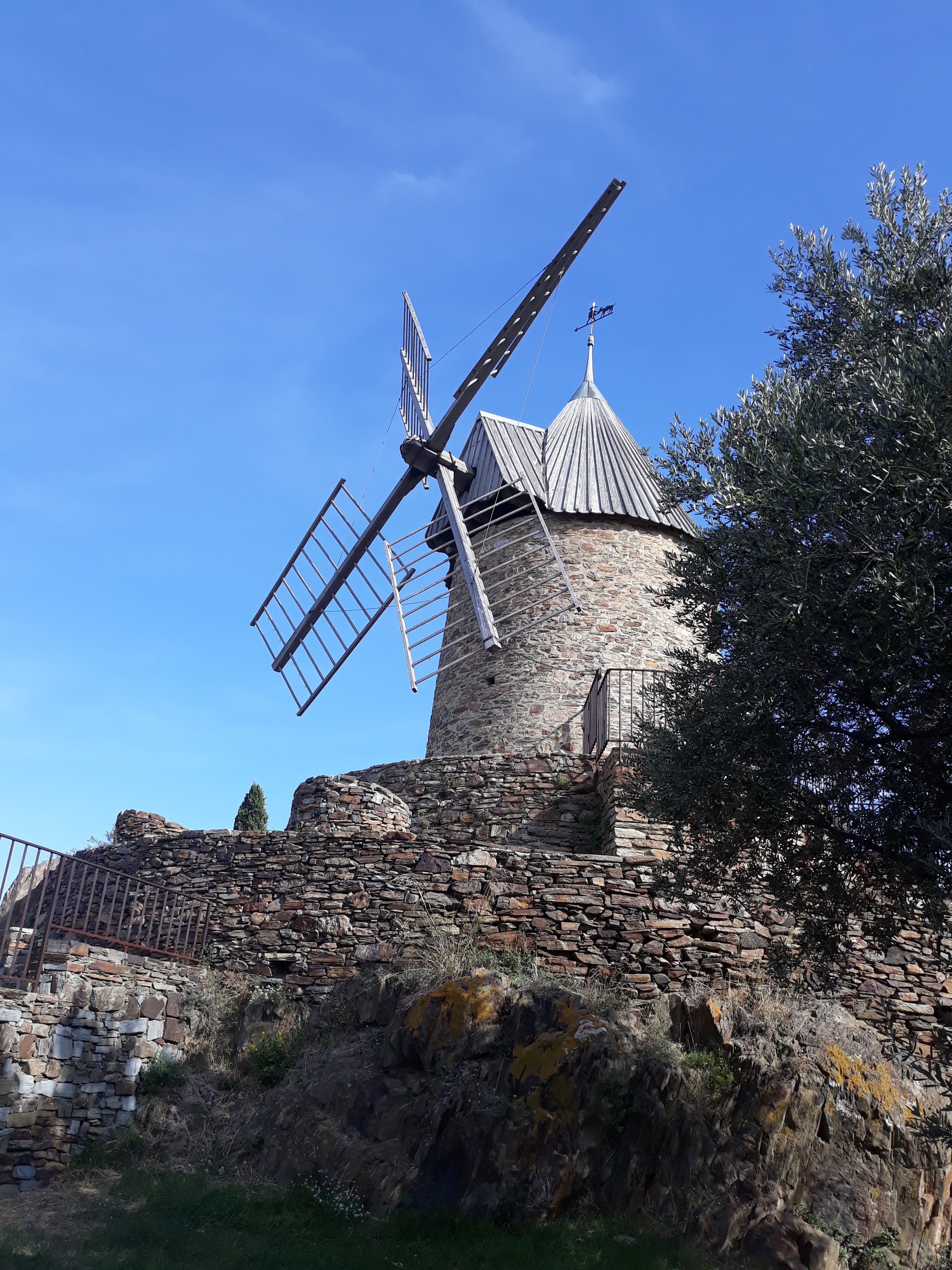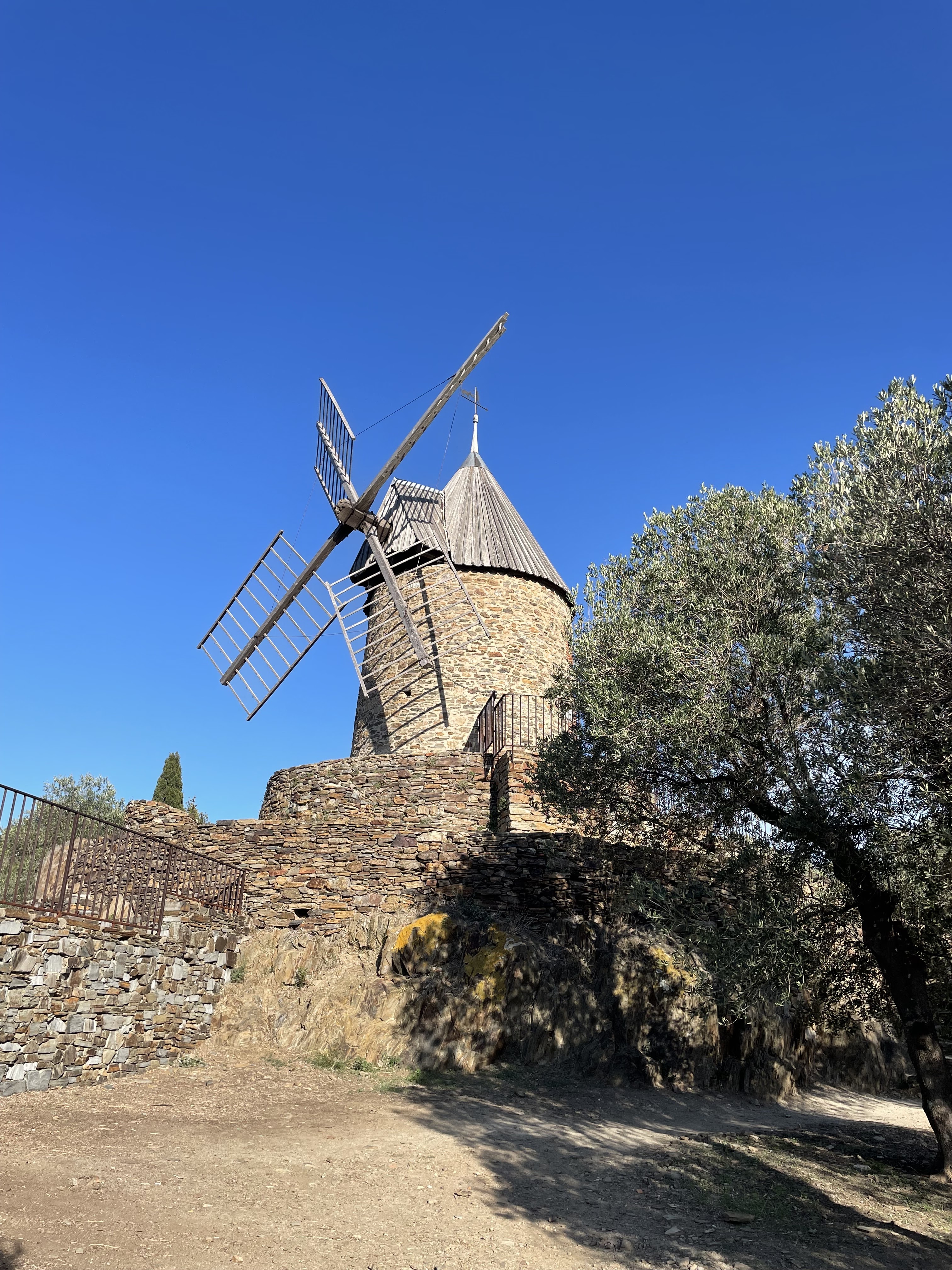 En provenance du Fort Saint Elme, cela prend 20 mn aller pour venir voir ce joli moulin à huile. Il culmine la baie de Collioure et offre une magnifie vue.