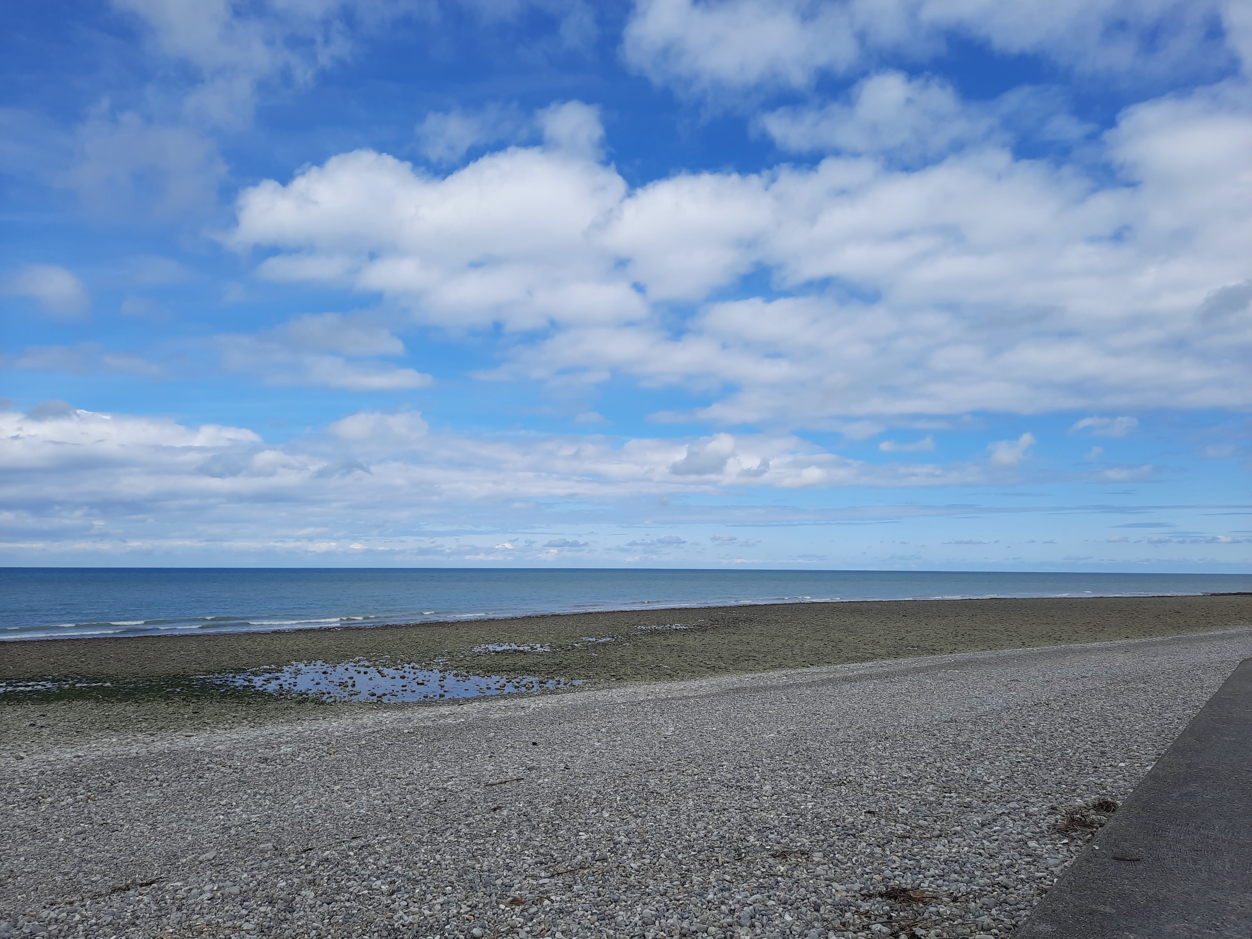 Grande plage de galets. Parking herbeux à proximité.