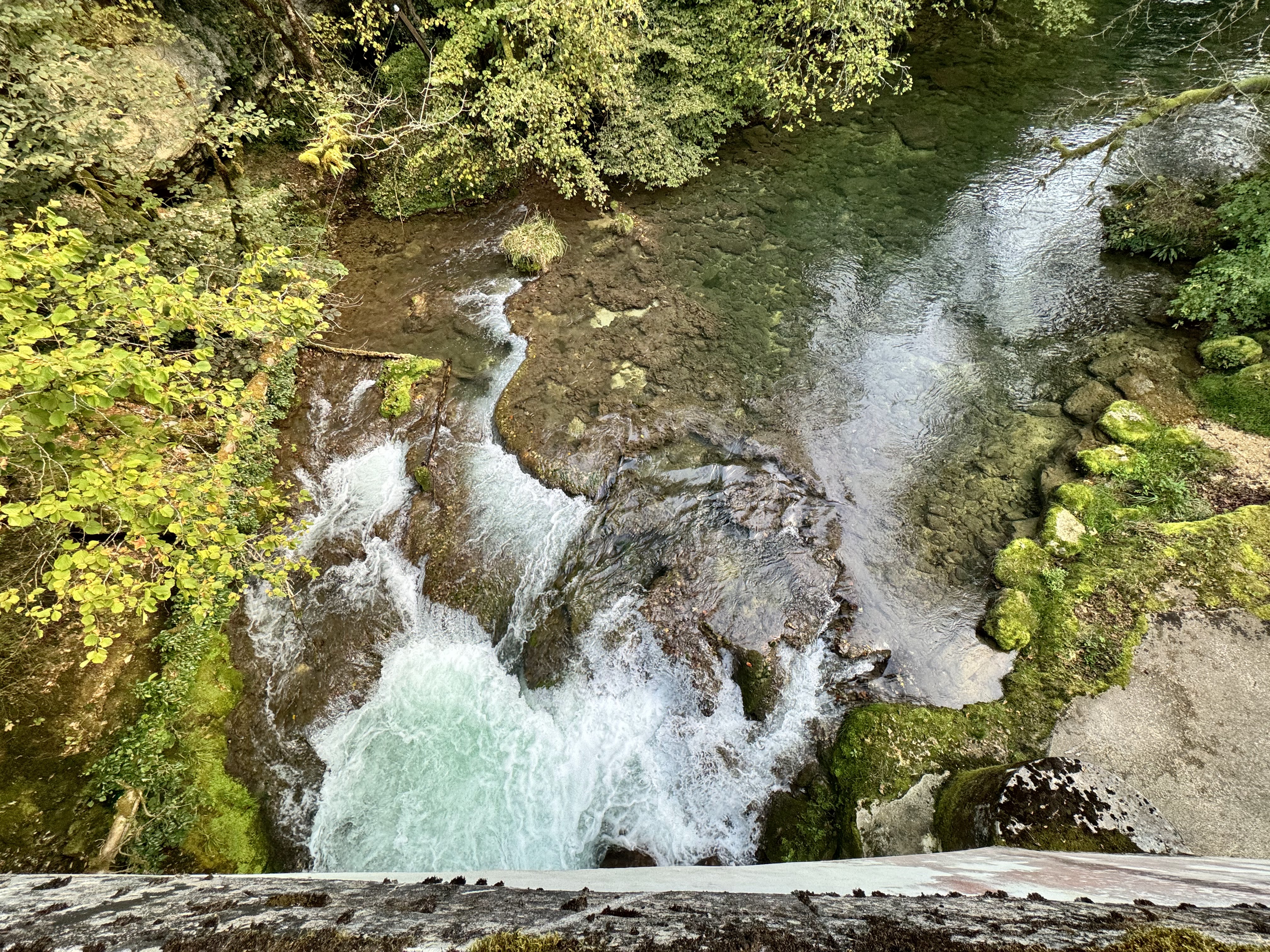 Détour du sentier de randonnée entre Mouthier-Haute-Pierre jusqu'à la Source de La Loue. A visiter absolument, très beau et quelque chose de magique. S'il y a une petite échelle en bas, vous pouvez monter. Vous pouvez voir l'échelle juste en dessous sur la photo à gauche du cours d'eau. Bien sûr, seulement avec peu d'eau.