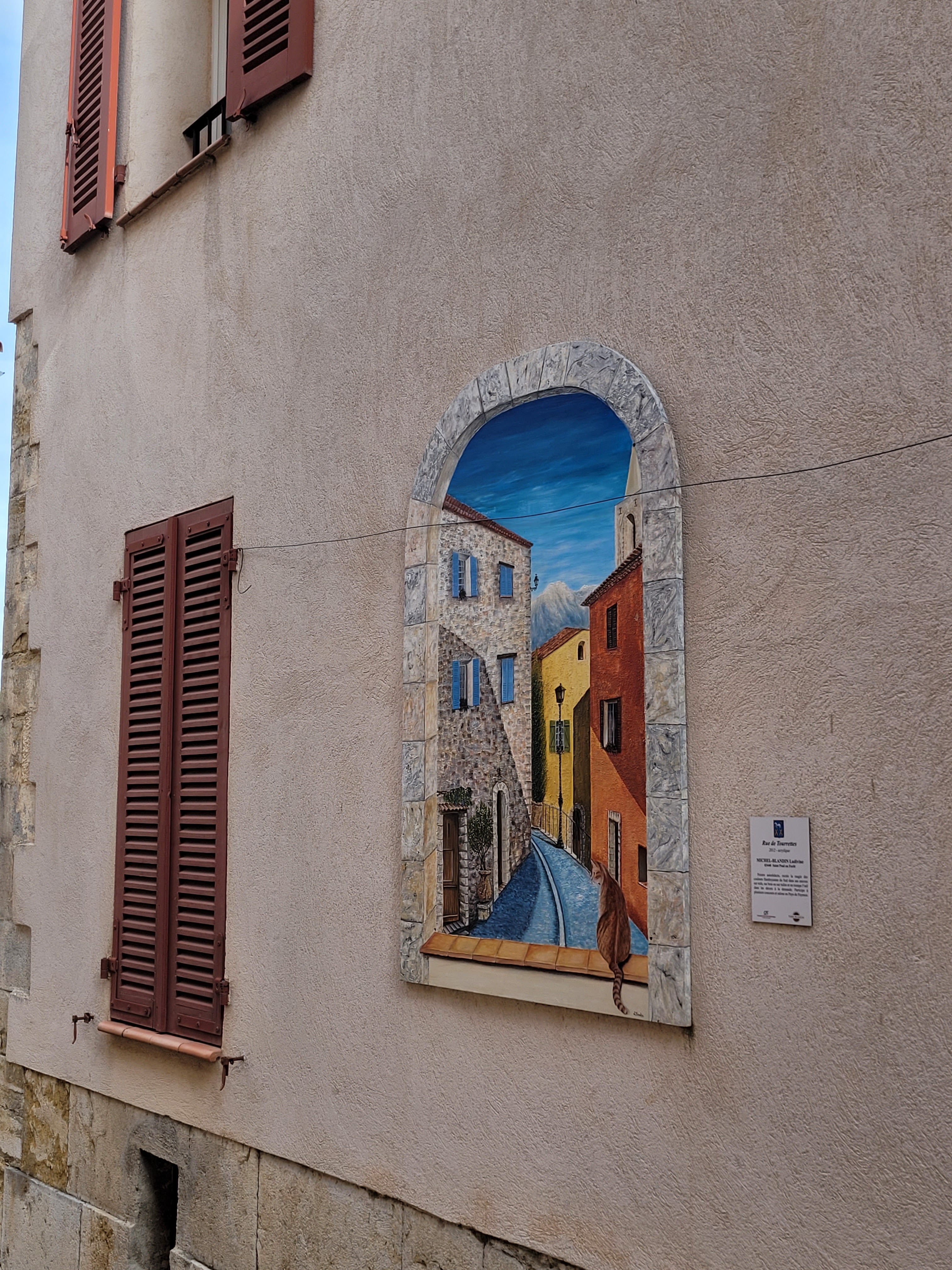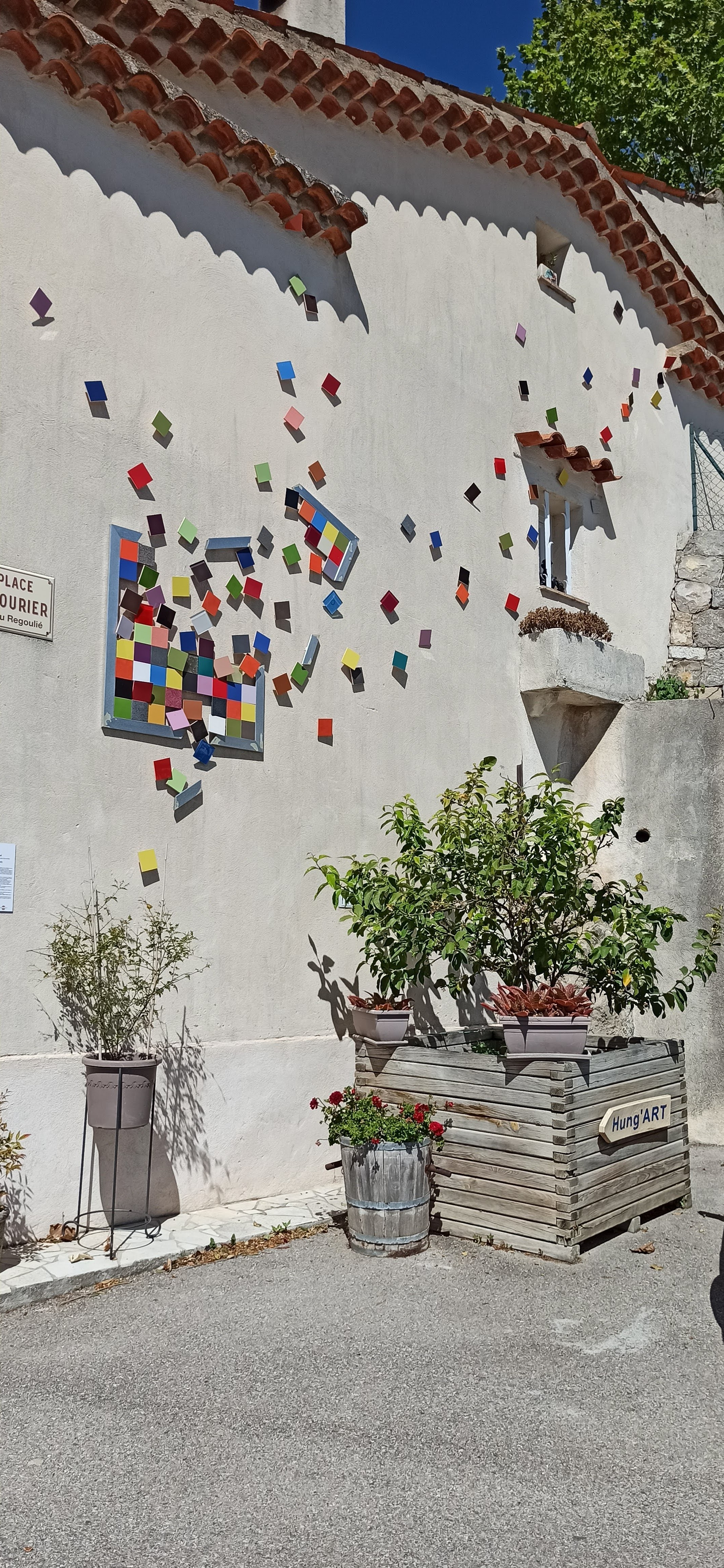 Village d'artistes mais en semaine en août tout est fermé.. Seuls 2 restaurants sur le village.. Des œuvres sont plzcardées sur les murs des maisons !! Pour les restaurants et l'animation rien ne vaut Fayence !!
