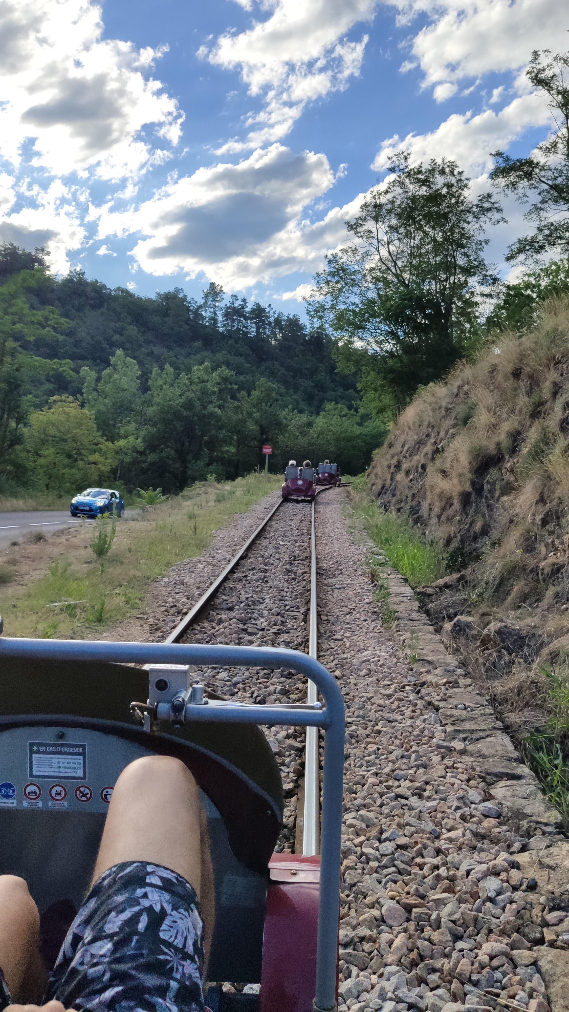 Petite balade récréative avec une belle météo et de beaux paysages. Descente des Châtaigniers avec début en autorail et le reste avec les vélo rail. Plutôt en faux plat / descente ce qui est agréable car il fait vite chaud.